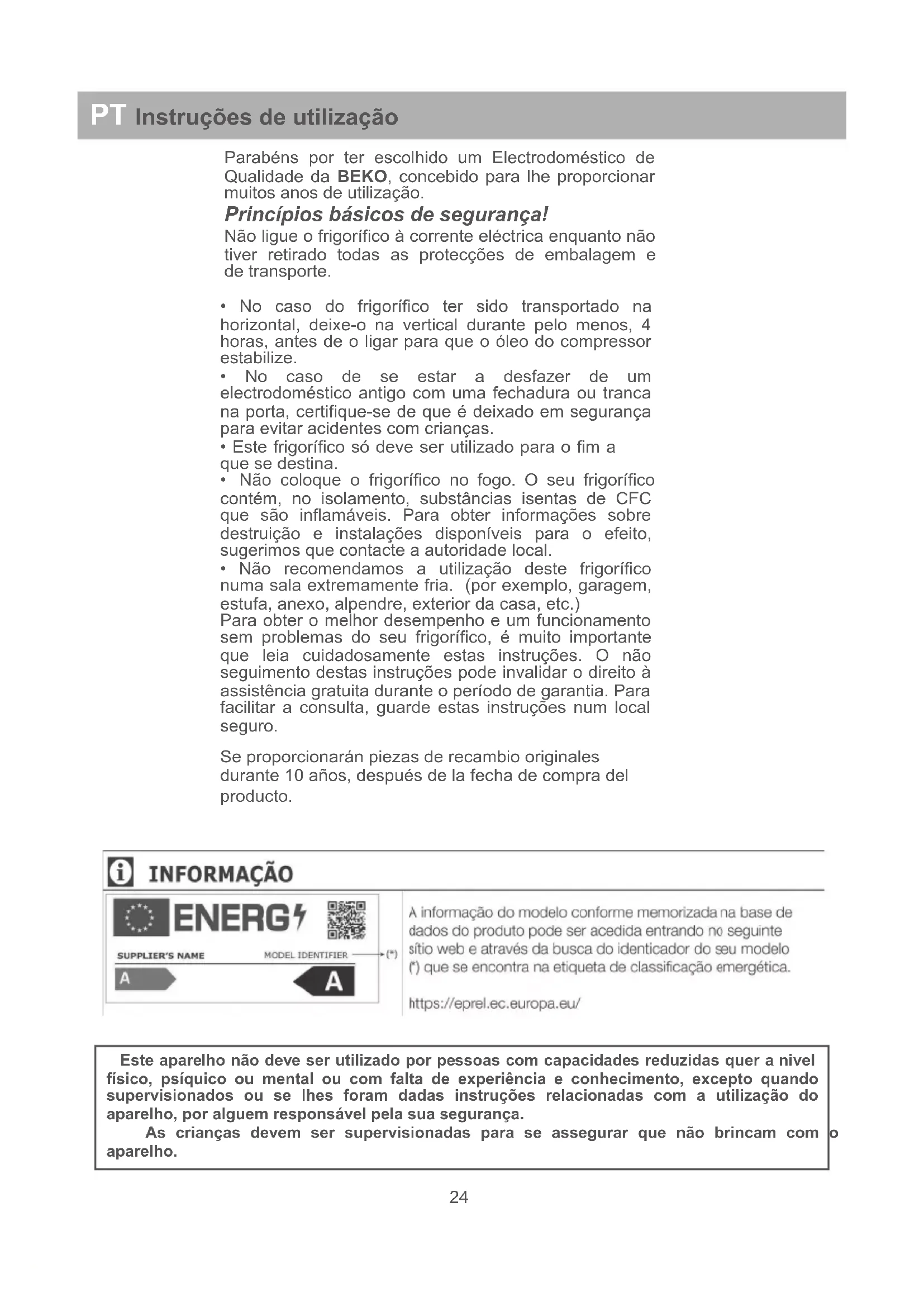 - Não recomendamos a utilização deste frigorífico numa sala extremamente fria. (por exemplo, garagem, estufa, anexo, alpendre, exterior da casa, etc.) Para obter o melhor desempenho e um funcionamento sem problemas do seu frigorífico, é muito importante que leia cuidadosamente estas instruções. O não seguimento destas instruções pode invalidar o direito à assistência gratuita durante o período de garantia. Para facilitar a consulta, guarde estas instruções num local seguro. Se proporcionarán piezas de recambio originales durante 10 años, después de la fecha de compra del producto. PT Instruções de utilização