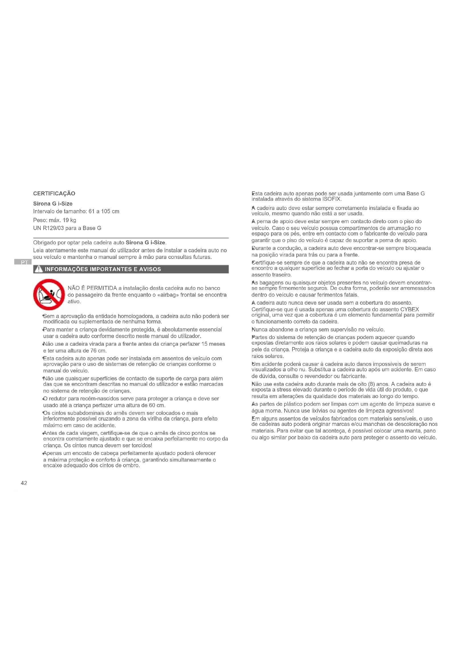 CERTIFICAÇÃO Sirona G i-Size Intervalo de tamanho: 61 a 105 cm Peso: máx. 19 kg UN R129/03 para a Base G Obrigado por optar pela cadeira auto Sirona G i-Size. Leia atentamente este manual do utilizador antes de instalar a cadeira auto no seu veículo e mantenha o manual sempre à mão para consultas futuras.