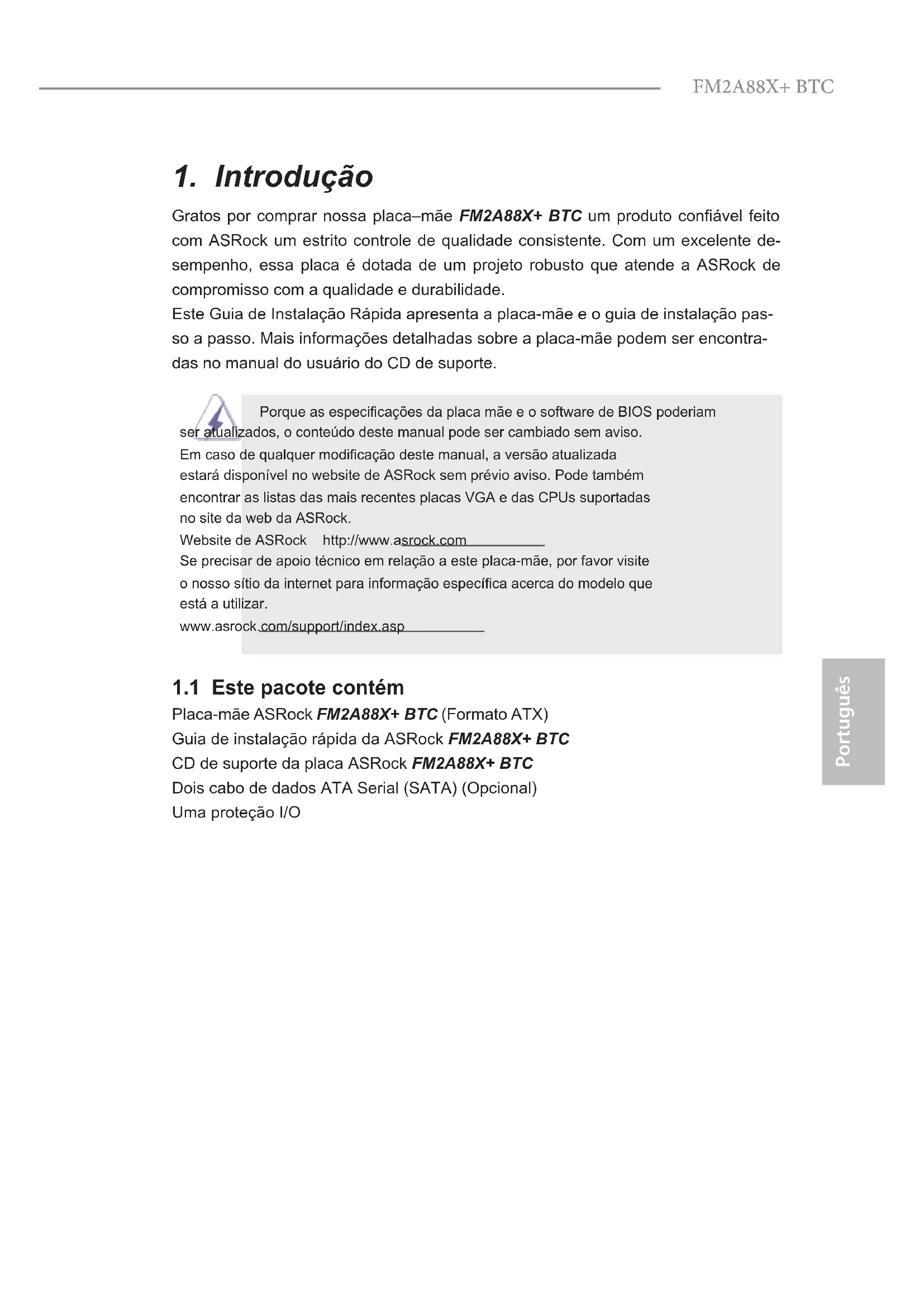 Gratos por comprar nossa placa–mãe FM2A88X+ BTC um produto conável feito com ASRock um estrito controle de qualidade consistente. Com um excelente de- sempenho, essa placa é dotada de um projeto robusto que atende a ASRock de compromisso com a qualidade e durabilidade. Este Guia de Instalação Rápida apresenta a placa-mãe e o guia de instalação pas- so a passo. Mais informações detalhadas sobre a placa-mãe podem ser encontra- das no manual do usuário do CD de suporte. Porque as especicações da placa mãe e o software de BIOS poderiam ser atualizados, o conteúdo deste manual pode ser cambiado sem aviso. Em caso de qualquer modicação deste manual, a versão atualizada estará disponível no website de ASRock sem prévio aviso. Pode também encontrar as listas das mais recentes placas VGA e das CPUs suportadas no site da web da ASRock. Website de ASRock http://www.asrock.com Se precisar de apoio técnico em relação a este placa-mãe, por favor visite o nosso sítio da internet para informação especíca acerca do modelo que está a utilizar. www.asrock.com/support/index.asp