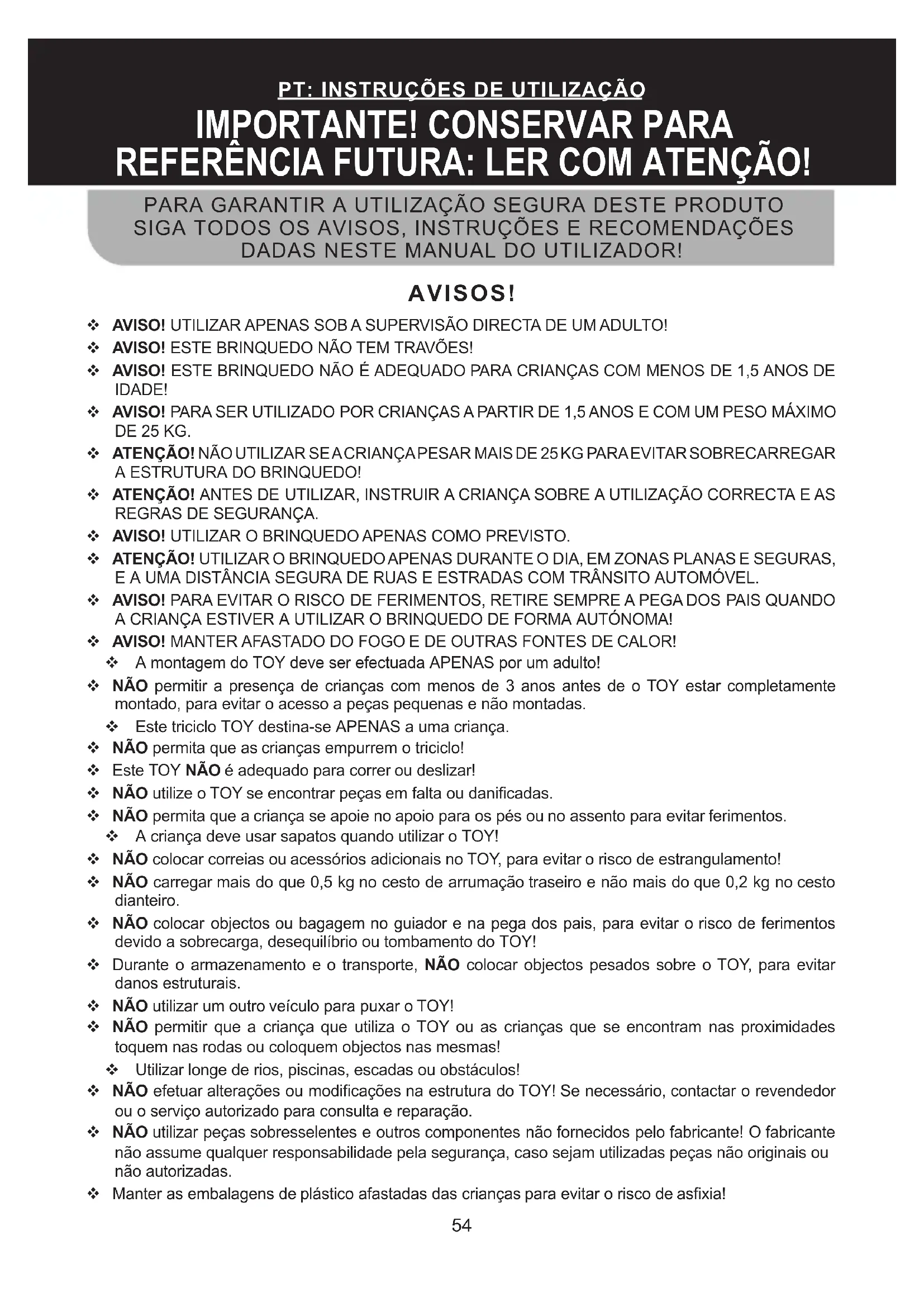 REFERÊNCIA FUTURA: LER COM ATENÇÃO! AVISOS! AVISO! UTILIZAR APENAS SOB A SUPERVISÃO DIRECTA DE UM ADULTO! AVISO! ESTE BRINQUEDO NÃO TEM TRAVÕES! AVISO! ESTE BRINQUEDO NÃO É ADEQUADO PARA CRIANÇAS COM MENOS DE 1,5 ANOS DE IDADE! AVISO! PARA SER UTILIZADO POR CRIANÇAS A PARTIR DE 1,5 ANOS E COM UM PESO MÁXIMO DE 25 KG. ATENÇÃO! NÃO UTILIZAR SE A CRIANÇA PESAR MAIS DE 25 KG PARA EVITAR SOBRECARREGAR A ESTRUTURA DO BRINQUEDO! ATENÇÃO! ANTES DE UTILIZAR, INSTRUIR A CRIANÇA SOBRE A UTILIZAÇÃO CORRECTA E AS REGRAS DE SEGURANÇA. AVISO! UTILIZAR O BRINQUEDO APENAS COMO PREVISTO. ATENÇÃO! UTILIZAR O BRINQUEDO APENAS DURANTE O DIA, EM ZONAS PLANAS E SEGURAS, E A UMA DISTÂNCIA SEGURA DE RUAS E ESTRADAS COM TRÂNSITO AUTOMÓVEL. AVISO! PARA EVITAR O RISCO DE FERIMENTOS, RETIRE SEMPRE A PEGA DOS PAIS QUANDO A CRIANÇA ESTIVER A UTILIZAR O BRINQUEDO DE FORMA AUTÓNOMA! AVISO! MANTER AFASTADO DO FOGO E DE OUTRAS FONTES DE CALOR! A montagem do TOY deve ser efectuada APENAS por um adulto! NÃO permitir a presença de crianças com menos de 3 anos antes de o TOY estar completamente montado, para evitar o acesso a peças pequenas e não montadas. Este triciclo TOY destina-se APENAS a uma criança. NÃO permita que as crianças empurrem o triciclo! Este TOY NÃO é adequado para correr ou deslizar! NÃO utilize o TOY se encontrar peças em falta ou danicadas. NÃO permita que a criança se apoie no apoio para os pés ou no assento para evitar ferimentos. A criança deve usar sapatos quando utilizar o TOY! NÃO colocar correias ou acessórios adicionais no TOY, para evitar o risco de estrangulamento! NÃO carregar mais do que 0,5 kg no cesto de arrumação traseiro e não mais do que 0,2 kg no cesto dianteiro. NÃO colocar objectos ou bagagem no guiador e na pega dos pais, para evitar o risco de ferimentos devido a sobrecarga, desequilíbrio ou tombamento do TOY! Durante o armazenamento e o transporte, NÃO colocar objectos pesados sobre o TOY, para evitar danos estruturais. NÃO utilizar um outro veículo para puxar o TOY! NÃO permitir que a criança que utiliza o TOY ou as crianças que se encontram nas proximidades toquem nas rodas ou coloquem objectos nas mesmas! Utilizar longe de rios, piscinas, escadas ou obstáculos! NÃO efetuar alterações ou modicações na estrutura do TOY! Se necessário, contactar o revendedor ou o serviço autorizado para consulta e reparação. NÃO utilizar peças sobresselentes e outros componentes não fornecidos pelo fabricante! O fabricante não assume qualquer responsabilidade pela segurança, caso sejam utilizadas peças não originais ou não autorizadas. Manter as embalagens de plástico afastadas das crianças para evitar o risco de asxia!