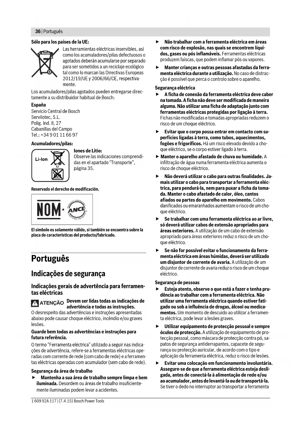 O nível de vibrações indicado nestas instruções foi medido de acordo com um processo de medição normalizado pela nor- ma EN 60745 e pode ser utilizado para a comparação de fer- ramentas eléctricas. Ele também é apropriado para uma ava- liação provisória da carga de vibrações. O nível de vibrações indicado representa as aplicações princi- pais da ferramenta eléctrica. Se, contudo, a ferramenta eléc- trica for utilizada para outras aplicações, com acessórios dife- rentes, com outras ferramentas de trabalho ou com manutenção insuficiente, é possível que o nível de vibrações seja diferente. Isto pode aumentar sensivelmente a carga de vibrações para o período completo de trabalho. Para uma estimação exacta da carga de vibrações, também deveriam ser considerados os períodos nos quais o aparelho está desligado ou funciona, mas não está sendo utilizado. Isto pode reduzir a carga de vibrações durante o completo perío- do de trabalho. Além disso também deverão ser estipuladas medidas de se- gurança para proteger o operador contra o efeito de vibra- ções, como por exemplo: manutenção de ferramentas eléctri- cas e de ferramentas de trabalho, manter as mãos quentes e organização dos processos de trabalho. Declaração de conformidade Declaramos sob nossa inteira responsabilidade que o pro- duto descrito nos “Dados técnicos” está em conformidade com todas as disposições pertinentes das Directivas 2011/65/UE, até 19 de Abril de 2016: 2004/108/CE, a partir de 20 de Abril de 2016: 2014/30/UE, 2006/42/CE incluindo suas alterações, e em conformidade com as seguin- tes normas: EN 60745-1, EN 60745-2-4. Processo técnico (2006/42/CE) em: Robert Bosch GmbH, PT/ETM9, 70764 Leinfelden-Echterdingen, GERMANY Robert Bosch GmbH, Power Tools Division 70764 Leinfelden-Echterdingen, GERMANY Leinfelden, 19.02.2015 Montagem Carregar o acumulador Utilize apenas os carregadores listados nos dados téc- nicos. Só estes carregadores são apropriados para os acu- muladores de iões de lítio utilizados para a sua ferramenta eléctrica. Nota: O acumulador é fornecido parcialmente carregado. Pa- ra assegurar a completa potência do acumulador, o acumula- dor deverá ser carregado completamente no carregador an- tes da primeira utilização. O acumulador de iões de lítio pode ser carregado a qualquer altura, sem que a sua vida útil seja reduzida. Uma interrupção do processo de carga não danifica o acumulador. Retirar o acumulador O acumulador 5 possui dois níveis de travamento, que devem evitar, que o acumulador possa cair, caso a tecla de destrava- mento do acumulador 3 seja premida por acaso. Enquanto o acumulador estiver dentro da ferramenta eléctrica, ele é man- tido em posição por uma mola. Para retirar o acumulador da ferramenta eléctrica 5, deverá premir a tecla de destravamento 3 e puxar o acumulador para trás. Não empregar força. Indicação do estado de carga do acumulador Os três LED verdes da indicação da carga do acumulador 6 in- dicam o setado de carga do acumulador 5. Por motivos de se- gurança, a consulta da situação de carga só pode ocorrer com a ferramenta eléctrica parada. Premir a tecla 7 para visualizar o estado de carga. Isto tam- bém é possível com o acumulador 5 retirado. Se após premir a tecla 7 não se iluminar nenhum LED, signifi- ca que o acumulador está com defeito e deve ser substituido. Henk Becker Executive Vice President Engineering Helmut Heinzelmann Head of Product Certification PT/ETM9 LED Capacidade Luz permanente 3 x verde 2/3 Luz permanente 2 x verde 1/3 Luz permanente 1 x verde <1/3 Luz intermitente 1 x verde Reserva OBJ_BUCH-1808-002.book Page 39 Tuesday, April 7, 2015 4:33 PM40 | Português 1 609 92A 117 | (7.4.15) Bosch Power Tools Troca de ferramenta O acumulador deverá ser retirado antes de todos os trabalhos no aparelho e antes de transportar ou de guardar a ferramenta eléctrica (p. ex. manutenção, troca de ferramenta). Há perigo de lesões se o interrup- tor de ligar-desligar for accionado involuntariamente. Usar luvas de protecção durante a substituição de fer- ramentas. Há perigo de lesões no caso de um contacto com as ferramentas de trabalho. Seleccionar a ferramenta de trabalho Montar/trocar a ferramenta de trabalho Se necessário deverá retirar uma ferramenta de trabalho já montada. Para isto é necessário abrir completamente a alavanca SDS 8 (não mais) e retirar a ferramenta de trabalho. Colocar a ferramenta de trabalho desejada (p. ex. lâmina de serra por imersão 11) na fixação de ferramentas 9, de modo que a curvatura mostre para baixo (veja a figura na página de gráficos, o texto da ferramenta de trabalho pode ser lido por cima). Girar a ferramenta de trabalho para uma posição apropriada para o respectivo trabalho e permitir que engate nos ressaltos da fixação da ferramenta 9. Estão disponíveis doze posições a cada 30°. Fechar a alavanca SDS 8, de modo que esteja encostada na carcaça da ferramenta eléctrica. Controlar a posição firme da ferramenta de trabalho. Ferramentas de trabalho incorrectamente ou insuficiente- mente fixas podem se soltar durante o funcionamento e apresentar um perigo para o operador. Colocar/substituir a folha de lixar na placa de lixar A placa de lixar 12 está equipada com um tecido de velcro, para uma fixação rápida de simples de folhas de lixar com aderência de velcro. Sacudir o tecido de velcro da placa de lixar 12 antes de colo- car a folha de lixar 13 para possibilitar uma aderência ideal. Posicionar a folha de lixar 13 de forma alinhada num dos la- dos da placa de lixar 12, e agora premir bem a folha de lixar sobre a placa de lixar. Para assegurar uma aspiração de pó ideal, deverá observar que os recortes na folha de lixar coincidam com os orifícios na placa de lixar. Para retirar a folha de lixar 13 deverá segurá-la por um a ponta e puxá-la da placa de lixar 12. Podem ser utilizadas todas as fo