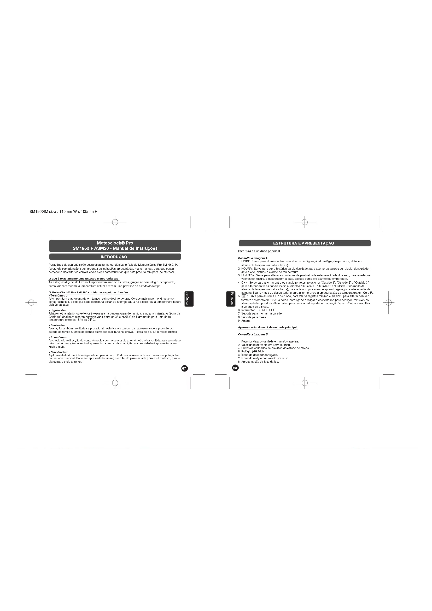 Outside 2 (canal 2) e Outside 3 (canal 3). As leituras da temperatura e da humidade alternam no receptor. Nota: se não tiver quaisquer sensores adicionais, por favor ignore esta função. Temperatura e humidade mínimas e máximas Prima [5] no modo de relógio para alternar entre: velocidade máxima do vento, temperatura máxima, temperatura mínima, humidade máxima e humidade mínima. Apresentação de HI e LO Caso seja apresentada a mensagem "Hi" ou "Lo" no ecrã, isso significa que a temperatura ou humidade saiu dos níveis especificados. O indicador da tendência apresenta a tendência da temperatura e da humidade determinada por esse sensor durante a última meia hora. SM1960IM size : 110mm W x 105mm H Português Português