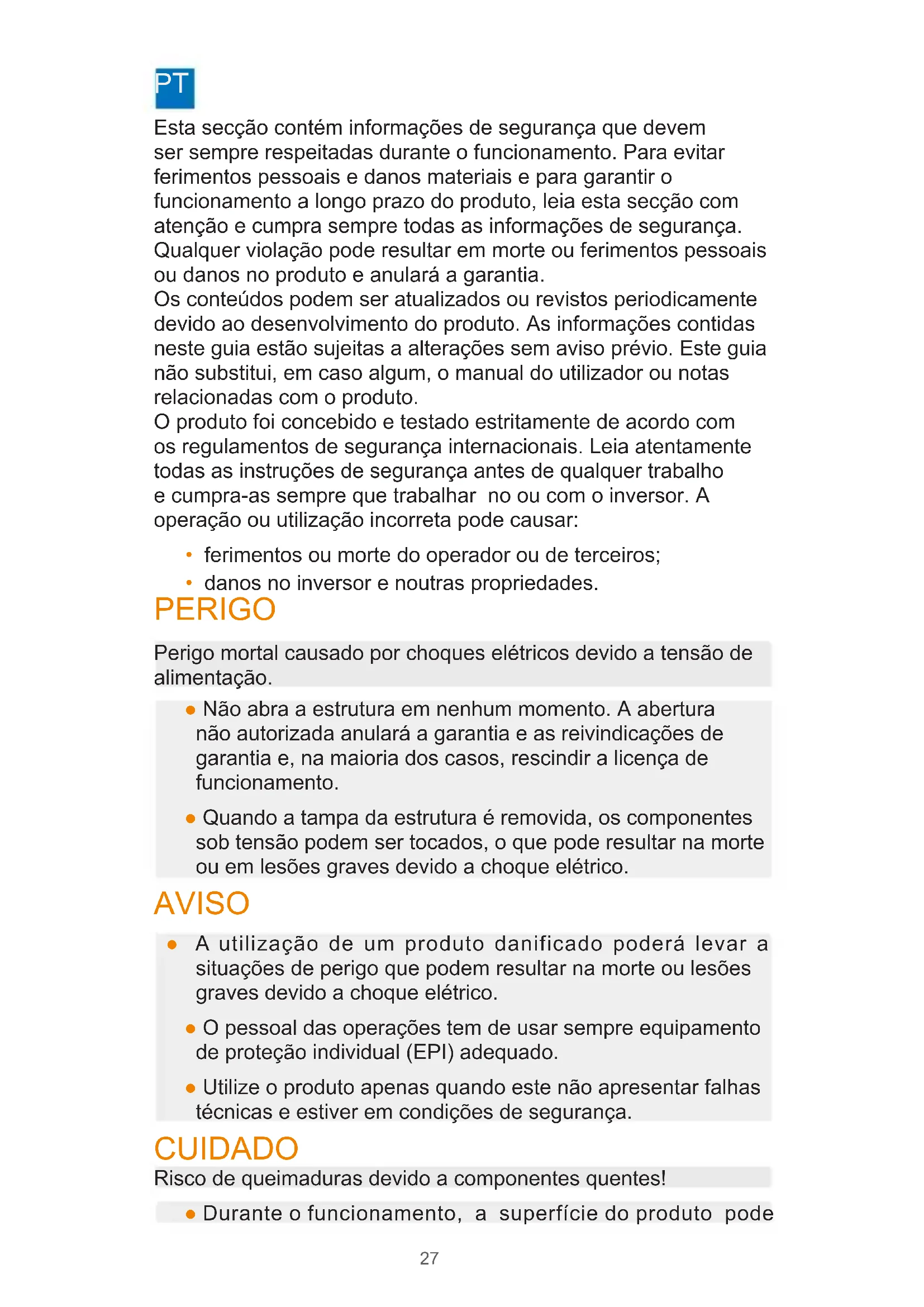 O produit foram concebido e testado estritamente de acordo com os regulamentos de segurarça internzonais. Leia atentamente todas as instruções de segurarça antes de qualquer trabalho e cumpra-as sempre que travailhar no ou com o inversor. A operação ou utilização incorrente pode causar: