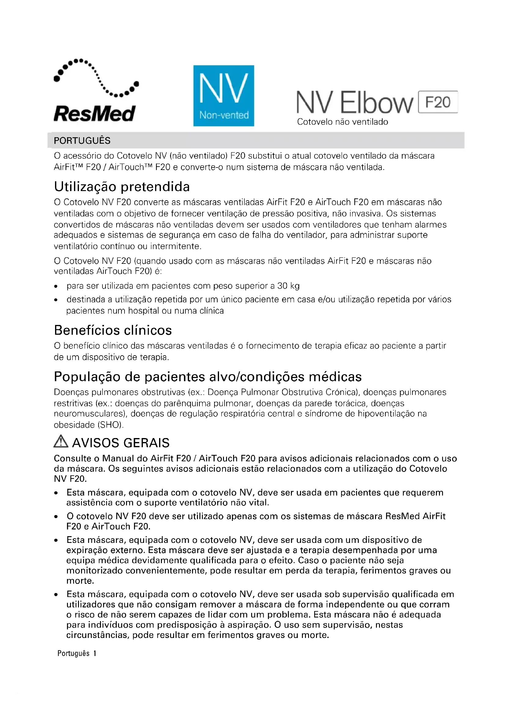 - destinada a utilização repetida por um único paciente em casa e/ou utilização repetida por vários pacientes num hospital ou numa clínica Benefícios clínicos O benefício clínico das máscaras ventiladas é o fornecimento de terapia eficaz ao paciente a partir de um dispositivo de terapia. População de pacientes alvo/condições médicas Doenças pulmonares obstrutivas (ex.: Doença Pulmonar Obstrutiva Crónica), doenças pulmonares restritivas (ex.: doenças do parênquima pulmonar, doenças da parede torácica, doenças neuromusculares), doenças de regulação respiratória central e síndrome de hipoventilação na obesidade (SHO). AVISOS GERAIS Consulte o Manual do AirFit F20 / AirTouch F20 para avisos adicionais relacionados com o uso da máscara. Os seguintes avisos adicionais estão relacionados com a utilização do Cotovelo NV F20.