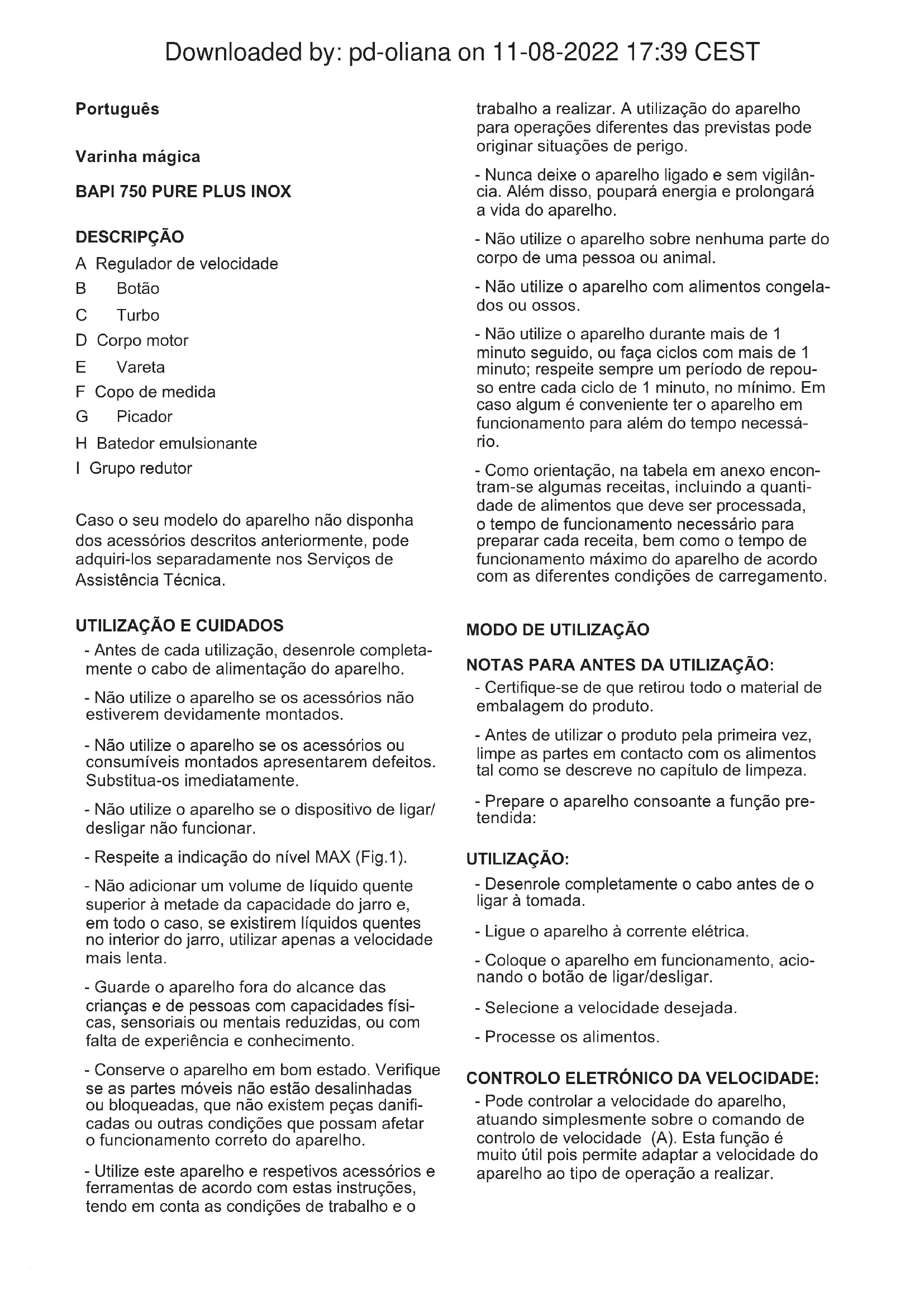 DESCRIPÇÃO A Regulador de velocidade B Botão C Turbo D Corpo motor E Vareta F Copo de medida G Picador H Batedor emulsionante I Grupo redutor Caso o seu modelo do aparelho não disponha dos acessórios descritos anteriormente, pode adquiri-los separadamente nos Serviços de Assistência Técnica.