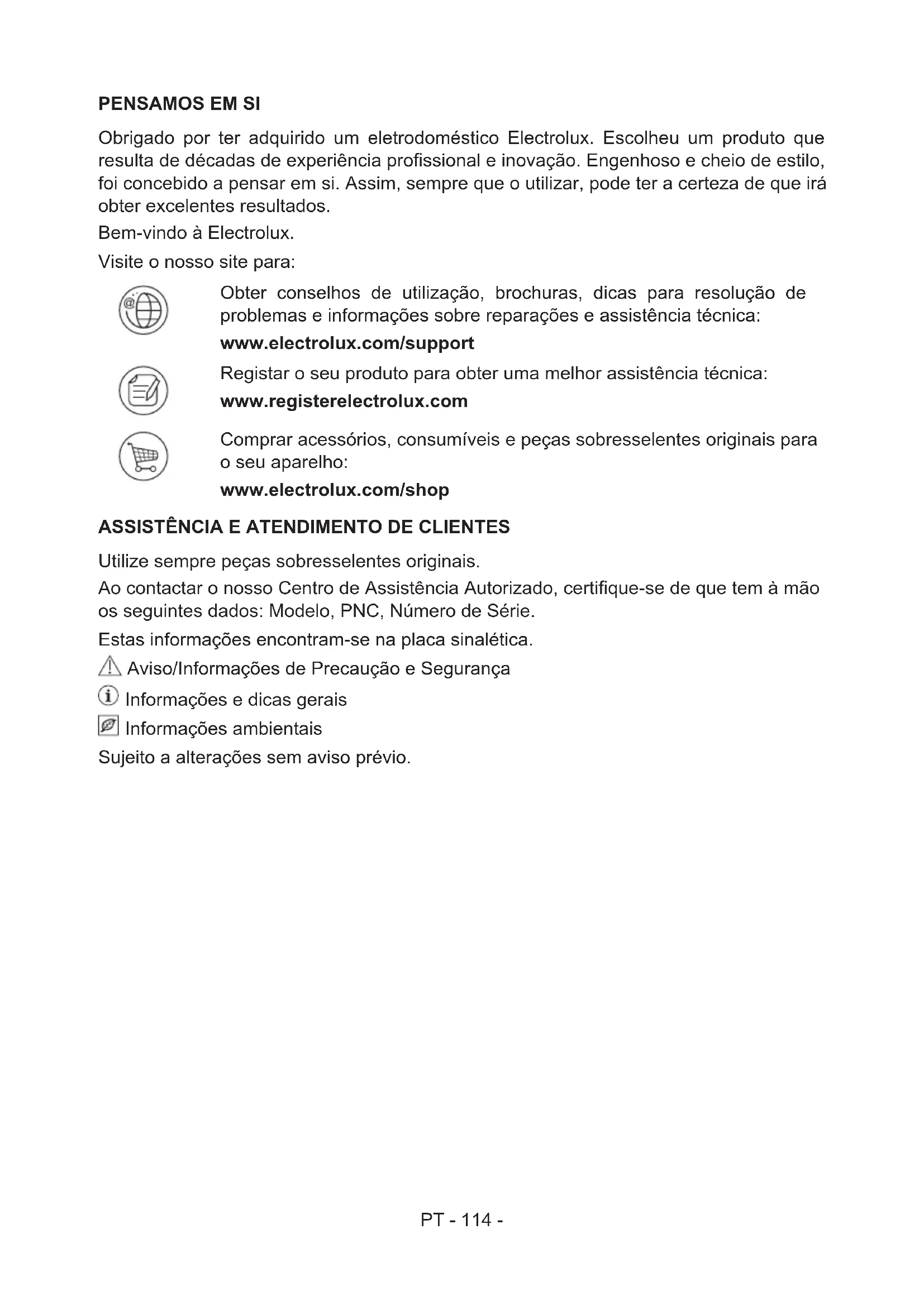 Obrigado por ter adquirido um eletrodoméstico Electrolux. Escolheu um produto que resulta de décadas de experiência prossional e inovação. Engenhoso e cheio de estilo, foi concebido a pensar em si. Assim, sempre que o utilizar, pode ter a certeza de que irá obter excelentes resultados. Bem-vindo à Electrolux. Visite o nosso site para: Obter conselhos de utilização, brochuras, dicas para resolução de problemas e informações sobre reparações e assistência técnica: www.electrolux.com/support Registar o seu produto para obter uma melhor assistência técnica: www.registerelectrolux.com Comprar acessórios, consumíveis e peças sobresselentes originais para o seu aparelho: www.electrolux.com/shop