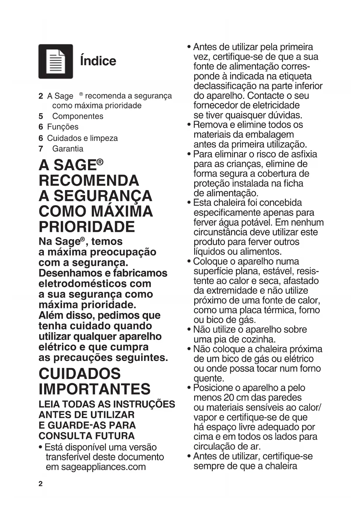 - Está disponível uma versão transferível deste documento em sageappliances.com 2 A Sage recomenda a segurança como máxima prioridade5 Componentes6 Funções6 Cuidados e limpeza7 Garantia3