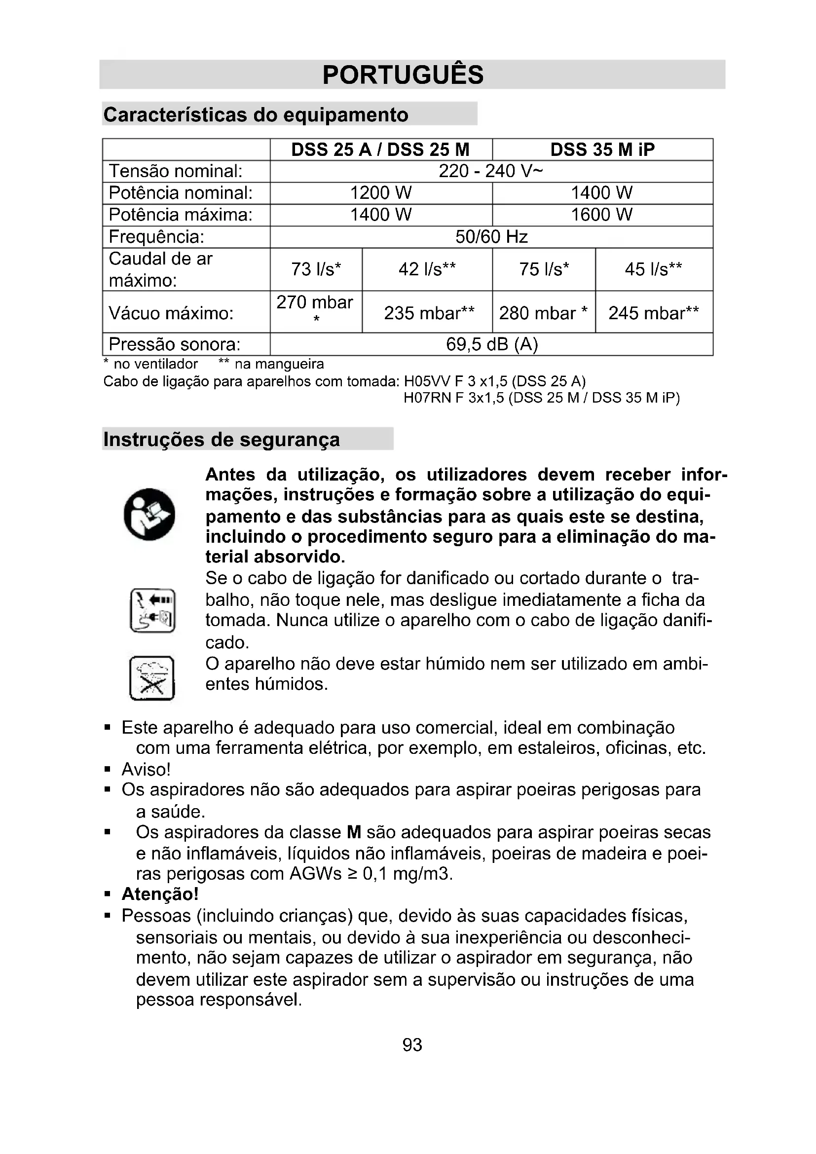 - no ventilador ** na mangueira Cabo de ligação para aparelhos com tomada: H05VV F 3 x1,5 (DSS 25 A) H07RN F 3x1,5 (DSS 25 M / DSS 35 M iP) Instruções de segurança