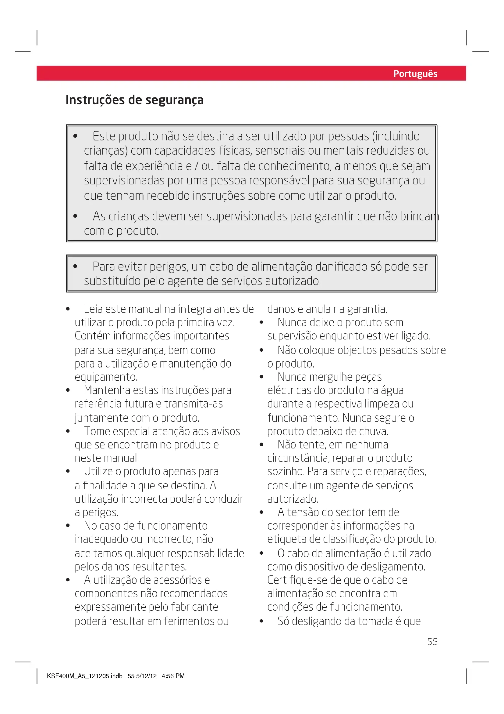 - Só desligando da tomada é que KSF400M_A5_121205.indb 55 5/12/12 4:56 PMPortuguês