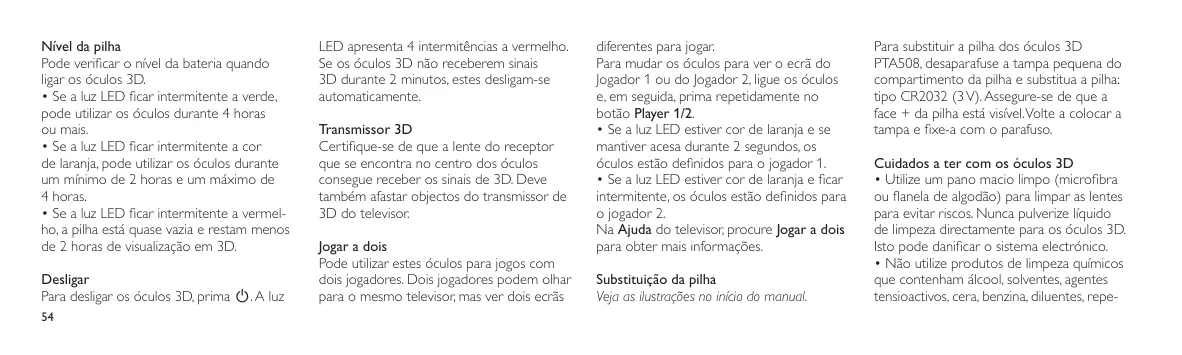 Player 1/2. • Si le voyant s’allume en orange de manière continue pendant 2 secondes, les lunettes sont réglées pour le joueur 1. • Si le voyant clignote en orange, les lunettes sont réglées pour le joueur 2. Sur le téléviseur, dans Aide, recherchez Jeu à deux pour de plus amples informations. Remplacement de la pile Voir les illustrations au début du manuel. Pour remplacer la pile des lunettes 3D PTA508, dévissez le petit couvercle du com-