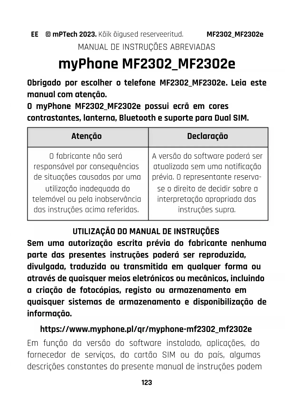 | O fabricante não está responsavel porunistações而导致as por uma utilização inadequada do telemóvel ou pela inobservência das instruções acima referidas. | A versão do software pode ser atualizada sem uma notifications prévia. Orepresentante reserva-se o direito de decide rapatireguapropriadadas instruções supra. |