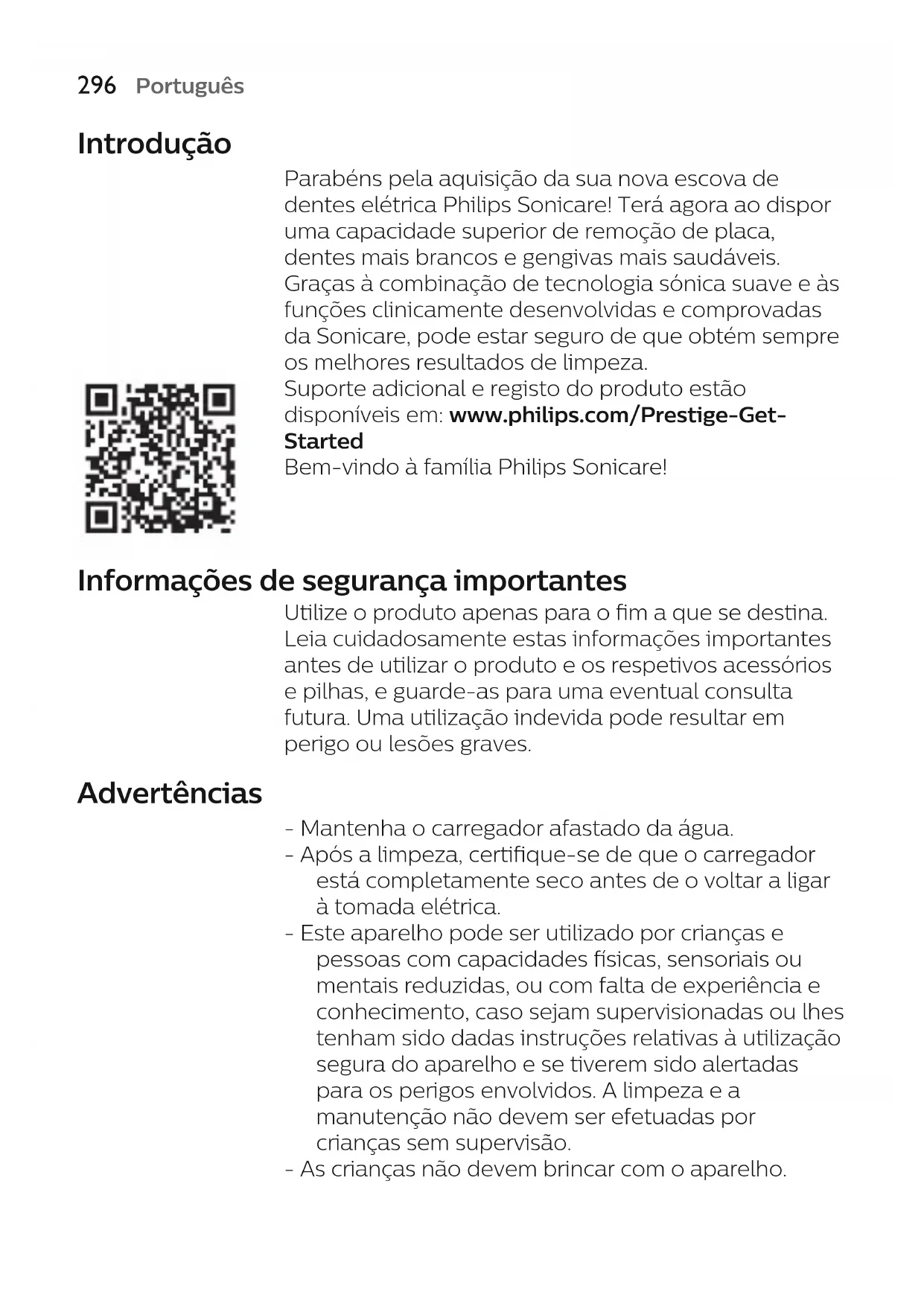 Português Introdução Parabéns pela aquisição da sua nova escova de dentes elétrica Philips Sonicare! Terá agora ao dispor uma capacidade superior de remoção de placa, dentes mais brancos e gengivas mais saudáveis. Graças à combinação de tecnologia sónica suave e às funções clinicamente desenvolvidas e comprovadas da Sonicare, pode estar seguro de que obtém sempre os melhores resultados de limpeza. Suporte adicional e registo do produto estão disponíveis em: www.philips.com/Prestige-Get- Started Bem-vindo à família Philips Sonicare! Informações de segurança importantes Utilize o produto apenas para o fim a que se destina. Leia cuidadosamente estas informações importantes antes de utilizar o produto e os respetivos acessórios e pilhas, e guarde-as para uma eventual consulta futura. Uma utilização indevida pode resultar em perigo ou lesões graves. Advertências - Mantenha o carregador afastado da água. - Após a limpeza, certifique-se de que o carregador está completamente seco antes de o voltar a ligar à tomada elétrica. - Este aparelho pode ser utilizado por crianças e pessoas com capacidades físicas, sensoriais ou mentais reduzidas, ou com falta de experiência e conhecimento, caso sejam supervisionadas ou lhes tenham sido dadas instruções relativas à utilização segura do aparelho e se tiverem sido alertadas para os perigos envolvidos. A limpeza e a manutenção não devem ser efetuadas por crianças sem supervisão. - As crianças não devem brincar com o aparelho.297 Português - Utilize apenas acessórios ou consumíveis originais da Philips. Utilize apenas o carregador fornecido com o produto. Se fornecidos, utilize apenas o cabo USB original e a fonte de alimentação com porta de saída USB. - Este aparelho não contém peças passíveis de assistência pelo utilizador. Se o aparelho estiver danificado, não o utilize e contacte o Centro de Apoio ao Cliente no seu país (consultar 'Garantia e assistência'). Se o cabo estiver danificado, substitua o carregador por um novo. - Não utilize o carregador no exterior nem próximo de superfícies aquecidas. - Não lave nenhuma das peças do produto na máquina de lavar a loiça. - Este aparelho destina-se unicamente à lavagem dos dentes, gengivas e língua. - Não utilize o aparelho e consulte o seu dentista/médico se ocorrer uma hemorragia excessiva após a utilização, se o sangramento continuar a ocorrer após 1 semana de utilização ou se sentir desconforto ou dor. - Se tiver sido submetido a uma cirurgia oral ou das gengivas nos últimos 2 meses, consulte o seu dentista antes de utilizar este aparelho. - Se tiver um pacemaker ou outro dispositivo implantado, consulte o seu médico ou o fabricante do dispositivo implantado antes da utilização. - Se tiver problemas de saúde, consulte o seu médico antes de utilizar este aparelho. - Este aparelho é um dispositivo de uso pessoal, pelo que não deve ser usado em vários pacientes em consultórios ou clínicas dentárias. - Interrompa a utilização da cabeça de escovagem se esta apresentar cerdas esmagadas ou dobradas. Substitua a cabeça de escovagem de 3 em 3 meses ou mais cedo no caso de aparecerem sinais de desgaste.298 Português - Se a sua pasta de dentes contiver peróxido ou bicarbonato de sódio (comum nas pastas de dentes branqueadoras), limpe cuidadosamente a cabeça da escova com sabão e água após cada utilização. Assim, previne possíveis fendas no plástico. - Evite o contacto direto com produtos que contenham óleos essenciais ou óleo de coco. Um contacto deste tipo pode resultar no deslocamento das cerdas. - Para carregar a bateria, utilize apenas o adaptador USB de parede, a base de carregamento e o estojo de viagem com carregamento fornecidos com os produtos: WAA1001, WAA2001, HX9200 ou