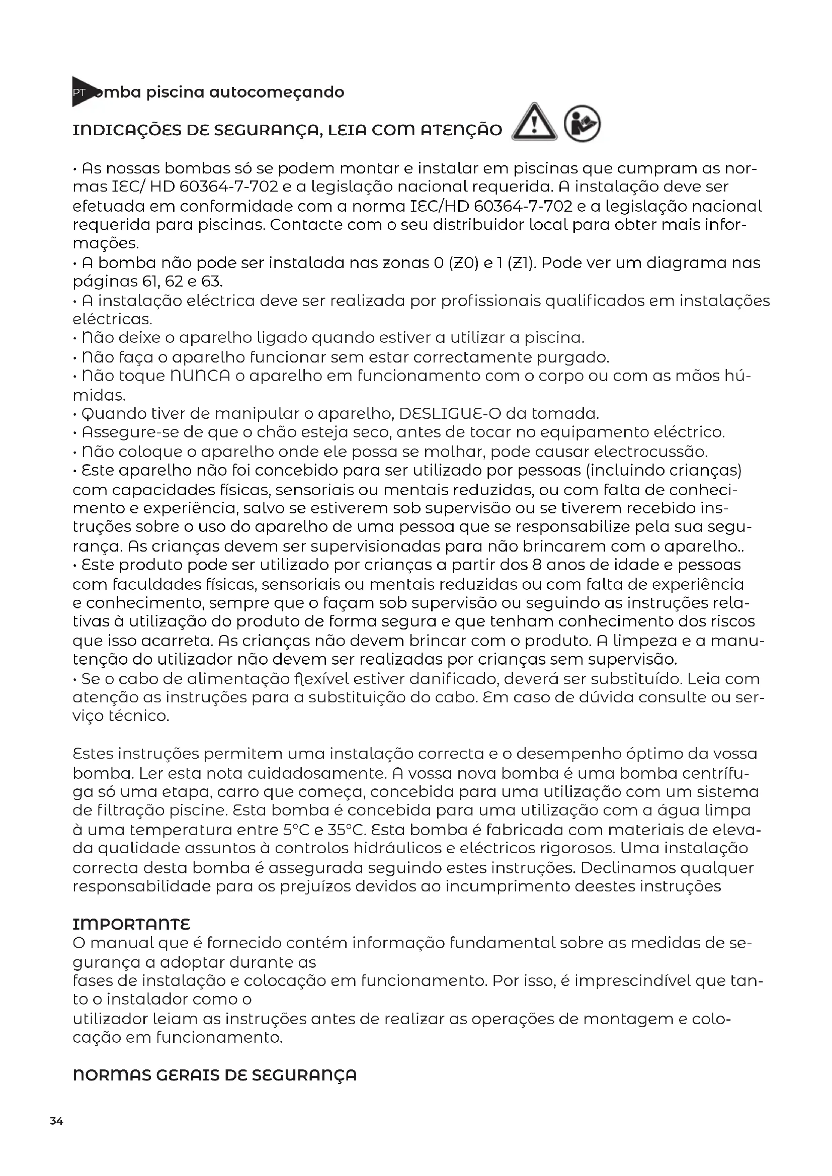 - As nossas bombas só se podem montar e instalar em piscinas que cumpram as nor- mas IEC/ HD 60364-7-702 e a legislação nacional requerida. A instalação deve ser efetuada em conformidade com a norma IEC/HD 60364-7-702 e a legislação nacional requerida para piscinas. Contacte com o seu distribuidor local para obter mais infor- mações.