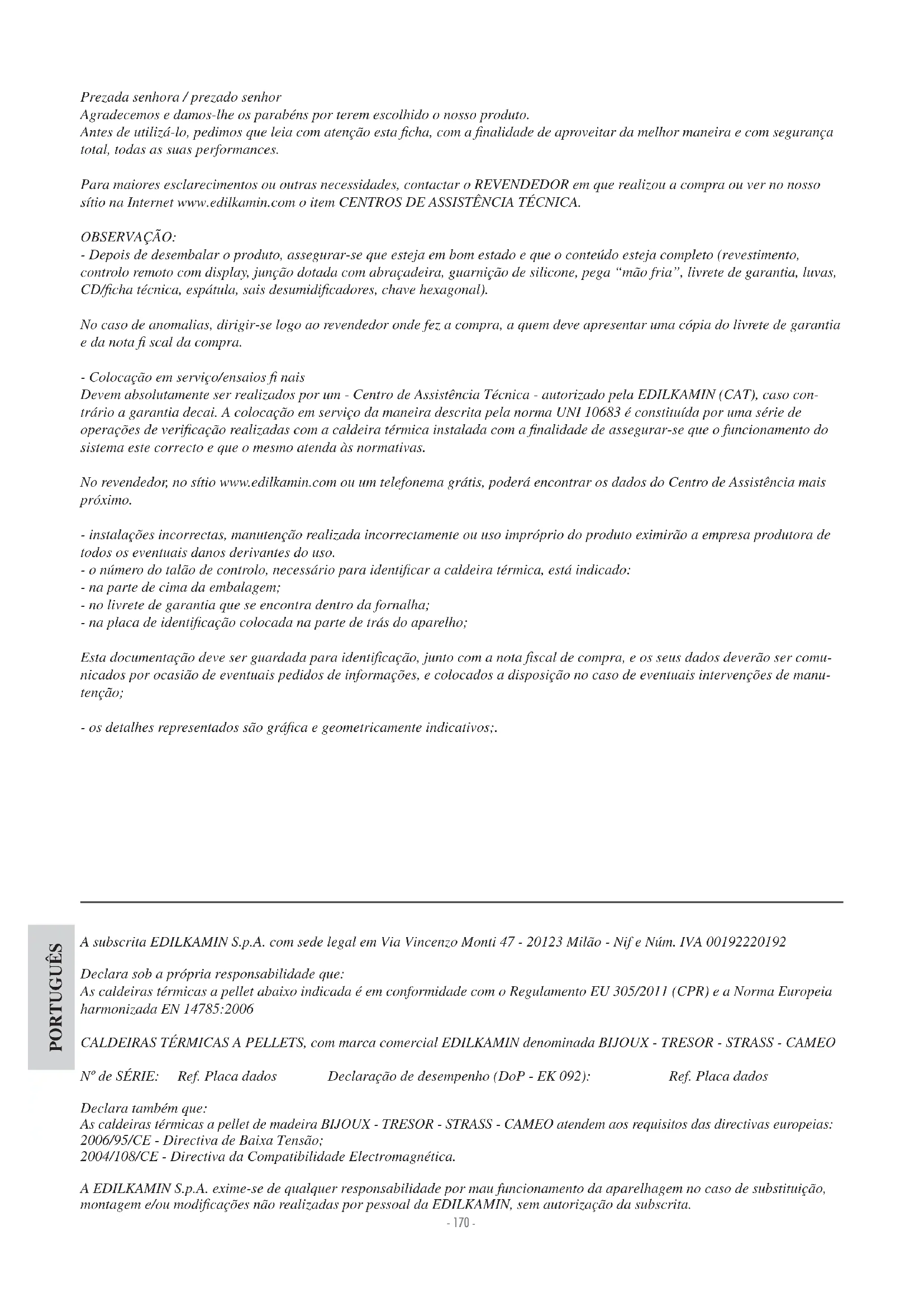Prezada senhora / prezado senhor Agradecemos e damos-lhe os parabéns por terem escolhido o nosso produto. Antes de utilizá-lo, pedimos que leia com atenção esta ¿ cha, com a ¿ nalidade de aproveitar da melhor maneira e com segurança total, todas as suas performances. Para maiores esclarecimentos ou outras necessidades, contactar o REVENDEDOR em que realizou a compra ou ver no nosso sítio na Internet www.edilkamin.com o item CENTROS DE ASSISTÊNCIA TÉCNICA. OBSERVAÇÃO: - Depois de desembalar o produto, assegurar-se que esteja em bom estado e que o conteúdo esteja completo (revestimento, controlo remoto com display, junção dotada com abraçadeira, guarnição de silicone, pega “mão fria”, livrete de garantia, luvas, CD/¿ cha técnica, espátula, sais desumidi¿ cadores, chave hexagonal). No caso de anomalias, dirigir-se logo ao revendedor onde fez a compra, a quem deve apresentar uma cópia do livrete de garantia e da nota ¿ scal da compra. - Colocação em serviço/ensaios ¿ nais Devem absolutamente ser realizados por um - Centro de Assistência Técnica - autorizado pela EDILKAMIN (CAT), caso con- trário a garantia decai. A colocação em serviço da maneira descrita pela norma UNI 10683 é constituída por uma série de operações de veri¿ cação realizadas com a caldeira térmica instalada com a ¿ nalidade de assegurar-se que o funcionamento do sistema este correcto e que o mesmo atenda às normativas. No revendedor, no sítio www.edilkamin.com ou um telefonema grátis, poderá encontrar os dados do Centro de Assistência mais próximo. - instalações incorrectas, manutenção realizada incorrectamente ou uso impróprio do produto eximirão a empresa produtora de todos os eventuais danos derivantes do uso. - o número do talão de controlo, necessário para identi¿ car a caldeira térmica, está indicado: - na parte de cima da embalagem; - no livrete de garantia que se encontra dentro da fornalha; - na placa de identi¿ cação colocada na parte de trás do aparelho; Esta documentação deve ser guardada para identi¿ cação, junto com a nota ¿ scal de compra, e os seus dados deverão ser comu- nicados por ocasião de eventuais pedidos de informações, e colocados a disposição no caso de eventuais intervenções de manu- tenção; - os detalhes representados são grá¿ ca e geometricamente indicativos;. A subscrita EDILKAMIN S.p.A. com sede legal em Via Vincenzo Monti 47 - 20123 Milão - Nif e Núm. IVA 00192220192 Declara sob a própria responsabilidade que: As caldeiras térmicas a pellet abaixo indicada é em conformidade com o Regulamento EU 305/2011 (CPR) e a Norma Europeia harmonizada EN 14785:2006 CALDEIRAS TÉRMICAS A PELLETS, com marca comercial EDILKAMIN denominada BIJOUX - TRESOR - STRASS - CAMEO Nº de SÉRIE: Ref. Placa dados Declaração de desempenho (DoP - EK 092): Ref. Placa dados Declara também que: As caldeiras térmicas a pellet de madeira BIJOUX - TRESOR - STRASS - CAMEO atendem aos requisitos das directivas europeias: 2006/95/CE - Directiva de Baixa Tensão; 2004/108/CE - Directiva da Compatibilidade Electromagnética. A EDILKAMIN S.p.A. exime-se de qualquer responsabilidade por mau funcionamento da aparelhagem no caso de substituição, montagem e/ou modi¿ cações não realizadas por pessoal da EDILKAMIN, sem autorização da subscrita.PORTUGUÊS