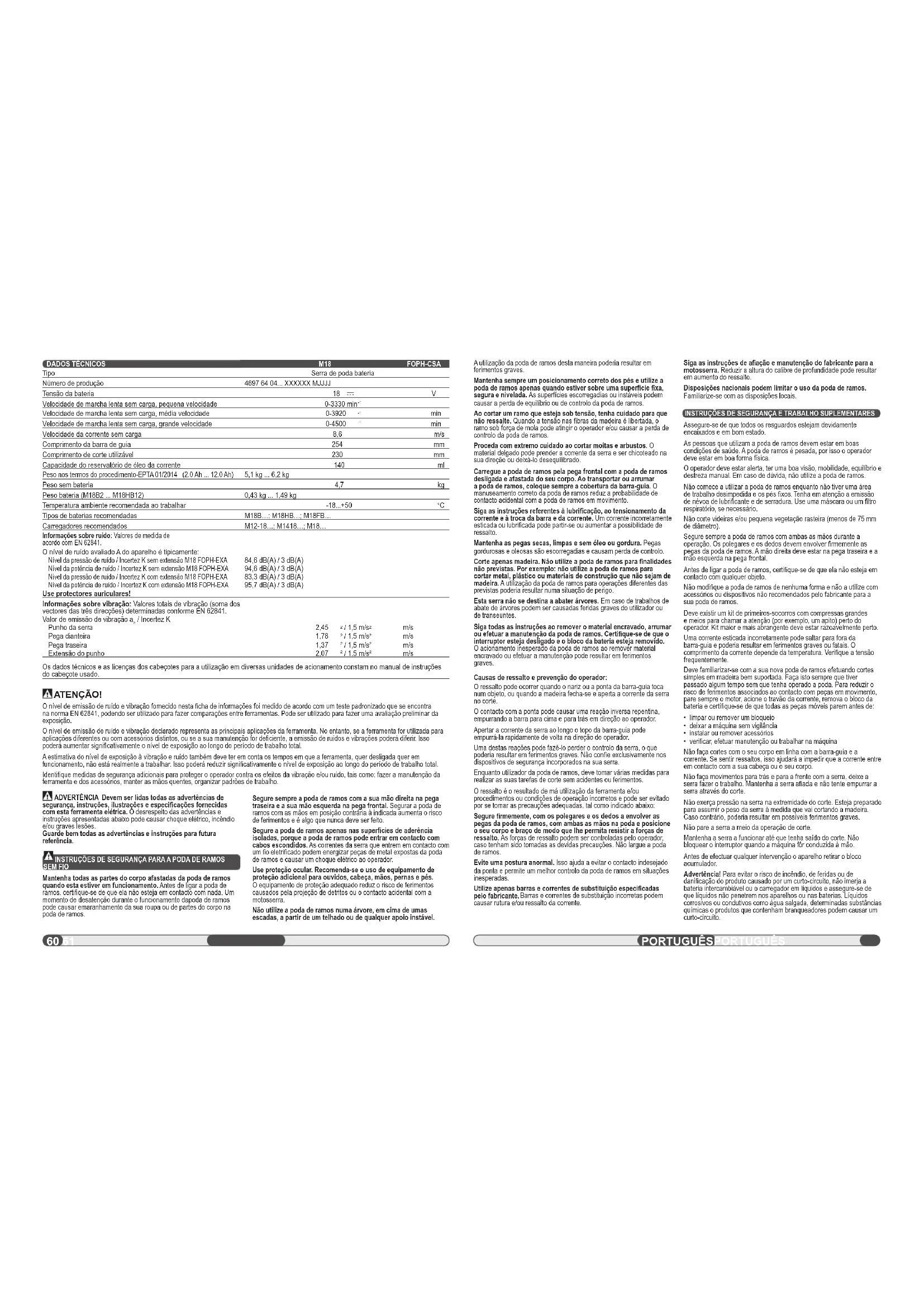 / Incertez K Punho da serra Pega dianteira Pega traseira Extensão do punho ADVERTÊNCIA Devem ser lidas todas as advertências de segurança, instruções, ilustrações e especifi cações fornecidas com esta ferramenta elétrica. O desrespeito das advertências e instruções apresentadas abaixo pode causar choque elétrico, incêndio e/ou graves lesões. Guarde bem todas as advertências e instruções para futura referência. INSTRUÇÕES DE SEGURANÇA PARA A PODA DE RAMOS SEM FIO Mantenha todas as partes do corpo afastadas da poda de ramos quando esta estiver em funcionamento. Antes de ligar a poda de ramos, certifi que-se de que ela não esteja em contacto com nada. Um momento de desatenção durante o funcionamento dapoda de ramos pode causar emaranhamento da sua roupa ou de partes do corpo na poda de ramos. Segure sempre a poda de ramos com a sua mão direita na pega traseira e a sua mão esquerda na pega frontal. Segurar a poda de ramos com as mãos em posição contrária à indicada aumenta o risco de ferimentos e é algo que nunca deve ser feito. Segure a poda de ramos apenas nas superfícies de aderência isoladas, porque a poda de ramos pode entrar em contacto com cabos escondidos. As correntes da serra que entrem em contacto com um fi o eletrifi cado podem energizar peças de metal expostas da poda de ramos e causar um choque elétrico ao operador. Use proteção ocular. Recomenda-se o uso de equipamento de proteção adicional para ouvidos, cabeça, mãos, pernas e pés. O equipamento de proteção adequado reduz o risco de ferimentos causados pela projeção de detritos ou o contacto acidental com a motosserra. Não utilize a poda de ramos numa árvore, em cima de umas escadas, a partir de um telhado ou de qualquer apoio instável. Os dados técnicos e as licenças dos cabeçotes para a utilização em diversas unidades de acionamento constam no manual de instruções do cabeçote usado. ATENÇÃO! O nível de emissão de ruído e vibração fornecido nesta fi cha de informações foi medido de acordo com um teste padronizado que se encontra na norma EN 62841, podendo ser utilizado para fazer comparações entre ferramentas. Pode ser utilizado para fazer uma avaliação preliminar da exposição. O nível de emissão de ruído e vibração declarado representa as principais aplicações da ferramenta. No entanto, se a ferramenta for utilizada para aplicações diferentes ou com acessórios distintos, ou se a sua manutenção for defi ciente, a emissão de ruídos e vibrações poderá diferir. Isso poderá aumentar signifi cativamente o nível de exposição ao longo do período de trabalho total. A estimativa do nível de exposição à vibração e ruído também deve ter em conta os tempos em que a ferramenta, quer desligada quer em funcionamento, não está realmente a trabalhar. Isso poderá reduzir signifi cativamente o nível de exposição ao longo do período de trabalho total. Identifi que medidas de segurança adicionais para proteger o operador contra os efeitos da vibração e/ou ruído, tais como: fazer a manutenção da ferramenta e dos acessórios, manter as mãos quentes, organizar padrões de trabalho. A utilização da poda de ramos desta maneira poderia resultar em ferimentos graves. Mantenha sempre um posicionamento correto dos pés e utilize a poda de ramos apenas quando estiver sobre uma superfície fi xa, segura e nivelada. As superfícies escorregadias ou instáveis podem causar a perda de equilíbrio ou de controlo da poda de ramos. Ao cortar um ramo que esteja sob tensão, tenha cuidado para que não ressalte. Quando a tensão nas fi bras da madeira é libertada, o ramo sob força de mola pode atingir o operador e/ou causar a perda de controlo da poda de ramos. Proceda com extremo cuidado ao cortar moitas e arbustos. O material delgado pode prender a corrente da serra e ser chicoteado na sua direção ou deixá-lo desequilibrado. Carregue a poda de ramos pela pega frontal com a poda de ramos desligada e afastada do seu corpo. Ao transportar ou arrumar a poda de ramos, coloque sempre a cobertura da barra-guia. O manuseamento correto da poda de ramos reduz a probabilidade de contacto acidental com a poda de ramos em movimento. Siga as instruções referentes à lubrifi cação, ao tensionamento da corrente e à troca da barra e da corrente. Um corrente incorretamente esticada ou lubrifi cada pode partir-se ou aumentar a possibilidade de ressalto. Mantenha as pegas secas, limpas e sem óleo ou gordura. Pegas gordurosas e oleosas são escorregadias e causam perda de controlo. Corte apenas madeira. Não utilize a poda de ramos para fi nalidades não previstas. Por exemplo: não utilize a poda de ramos para cortar metal, plástico ou materiais de construção que não sejam de madeira. A utilização da poda de ramos para operações diferentes das previstas poderia resultar numa situação de perigo. Esta serra não se destina a abater árvores. Em caso de trabalhos de abate de árvores podem ser causadas feridas graves do utilizador ou de transeuntes. Siga todas as instruções ao remover o material encravado, arrumar ou efetuar a manutenção da poda de ramos. Certifi que-se de que o interruptor esteja desligado e o bloco da bateria esteja removido. O acionamento inesperado da poda de ramos ao remover material encravado ou efetuar a manutenção pode resultar em ferimentos graves. Causas de ressalto e prevenção do operador: O ressalto pode ocorrer quando o nariz ou a ponta da barra-guia toca num objeto, ou quando a madeira fecha-se e aperta a corrente da serra no corte. O contacto com a ponta pode causar uma reação inversa repentina, empurrando a barra para cima e para trás em direção ao operador. Apertar a corrente da serra ao longo o topo da barra-guia pode empurrá-la rapidamente de volta na direção do operador. Uma destas reações pode fazê-lo perder o controlo da serra, o que poderia resultar em ferimentos graves. Não confi e exc