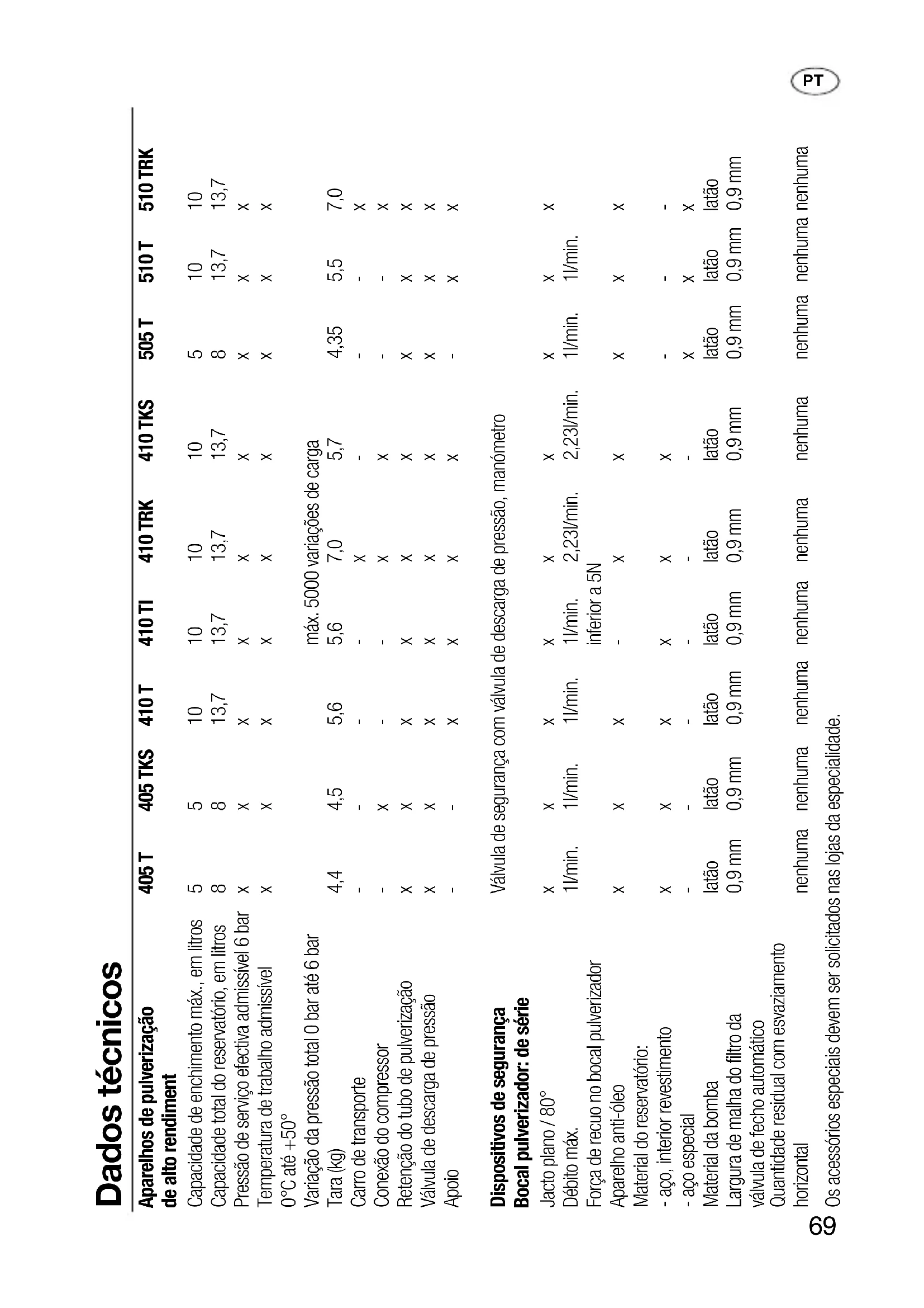 - Dados técnicos Aparelhos de pulverização 405 T 405 TKS 410 T 410 TI 410 TRK 410 TKS 505 T 510 T 510 TRK de alto rendiment Capacidade de enchimento máx., em litros 5 5 10 10 10 10 5 10 10 Capacidade total do reservatório, em litros 8 8 13,7 13,7 13,7 13,7 8 13,7 13,7 Pressão de serviço efectiva admissível 6 bar x x x x x x x x x Temperatura de trabalho admissível x x x x x x x x x 0°C até +50° Variação da pressão total 0 bar até 6 bar máx. 5000 variações de carga Tara (kg) 4,4 4,5 5,6 5,6 7,0 5,7 4,35 5,5 7,0 Carro de transporte - - - - x - - - x Conexão do compressor - x - - x x - - x Retenção do tubo de pulverização x x x x x x x x x Válvula de descarga de pressão x x x x x x x x x Apoio - - x x x x - x x Dispositivos de segurança Válvula de segurança com válvula de descarga de pressão, manómetro Bocal pulverizador: de série Jacto plano / 80° x x x x x x x x x Débito máx. 1l/min. 1l/min. 1l/min. 1l/min. 2,23l/min. 2,23l/min. 1l/min. 1l/min. Força de recuo no bocal pulverizador inferior a 5N Aparelho anti-óleo x x x - x x x x x Material do reservatório: - aço, interior revestimento x x x x x x - - - - aço especial - - - - - - x x x Material da bomba latão latão latão latão latão latão latão latão latão Largura de malha do filtro da 0,9 mm 0,9 mm 0,9 mm 0,9 mm 0,9 mm 0,9 mm 0,9 mm 0,9 mm 0,9 mm válvula de fecho automático Quantidade residual com esvaziamento horizontal nenhuma nenhuma nenhuma nenhuma nenhuma nenhuma nenhuma nenhuma nenhuma Os acessórios especiais devem ser solicitados nas lojas da especialidade.70 Índice Dados técnicos p. 69