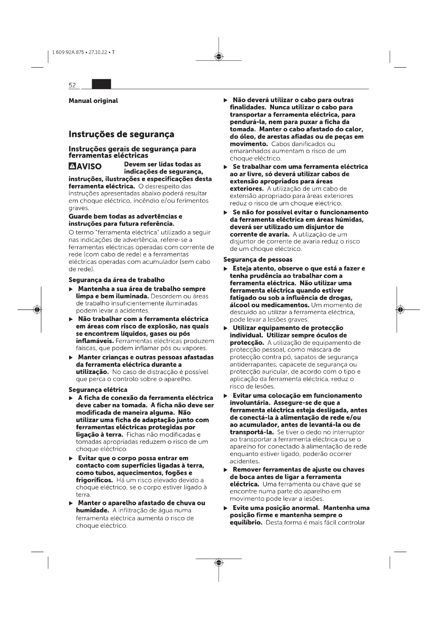 (Os dados para serrar placas de aglomerado de madeira aplicam-se a uma espessura da peça de 20mm.) O nível de vibrações indicado nestas instruções e o valor de emissões sonoras foram medidos de acordo com um processo de medição normalizado e podem ser utilizados para a comparação de ferramentas elétricas. Também são adequados para uma avaliação provisória das emissões sonoras e de vibrações. O nível de vibrações indicado e o valor de emissões sonoras representam as aplicações principais da ferramenta elétrica. Se a ferramenta elétrica for utilizada para outras aplicações, com outras ferramentas de trabalho ou com manutenção insuficiente, é possível que o nível de vibrações e de emissões sonoras seja diferente. Isto pode aumentar sensivelmente a emissão sonora e de vibrações para o período completo de trabalho. Para uma estimação exata da emissão sonora e de vibrações, também deveriam ser considerados os períodos nos quais o aparelho pt 55 1 609 92A 875 • 27.10.22 • Testá desligado ou funciona, mas não está sendo utilizado. Isto pode reduzir a emissão sonora e de vibrações durante o completo período de trabalho. Além disso também deverão ser estipuladas medidas de segurança para proteger o operador contra o efeito de vibrações, como por exemplo: manutenção de ferramentas elétricas e acessórios, manter as mãos quentes e organização dos processos de trabalho. BateriaPortuguês Carregar a bateriaPortuguês u Utilize apenas os carregadores listados nos dados técnicos. Só estes carregadores são apropriados para os baterias de lítio utilizadas para a sua ferramenta elétrica. Nota: devido a normas de transporte internacionais, as baterias de lítio são fornecidas parcialmente carregadas. Para assegurar a completa potência da bateria, a bateria deverá ser carregada completamente antes da primeira utilização. Colocar a bateriaPortuguês Insira a bateria carregada no respetivo encaixe, até que esta esteja engatada. Retirar a bateriaPortuguês Para retirar a bateria, pressione a respetiva tecla de desbloqueio e puxe a bateria para fora. Não empregue força. A bateriapossui 2 níveis de travamento, que devem evitar, que a bateria caia, caso a tecla de desbloqueio da bateriaseja premida por acaso. Enquanto a bateria estiver dentro da ferramenta elétrica, ela é mantida em posição por uma mola. Indicador do nível de carga da bateriaPortuguês Os LEDs verdes do indicador do nível de carga da bateria indicam o nível de carga da bateria. Por motivos de segurança, a consulta do nível de carga só é possível com a ferramenta elétrica parada. Prima a tecla para o indicador do nível de carga da bateria ou para visualizar o nível de carga. Isto também é possível com a bateria removida. Se, depois de premir a tecla para o indicador do nível de carga da bateria, não se acender qualquer LED, a bateria tem defeito e tem de ser substituída. Tipo de bateria GBA 18V...Português LED Capacidade Luz permanente 3× verde 60–100% Luz permanente 2× verde 30–60% Luz permanente 1× verde 5–30% Luz intermitente 1× verde 0–5% Tipo de bateria ProCORE18V...Português LED Capacidade Luz permanente 5× verde 80–100% Luz permanente 4× verde 60–80% Luz permanente 3× verde 40–60% Luz permanente 2× verde 20–40% Luz permanente 1× verde 5–20% Luz intermitente 1× verde 0–5% Indicações sobre o manuseio ideal da bateriaPortuguês Proteger a bateria contra humidade e água. Armazene a bateria apenas na faixa de temperatura de −20°C a 50°C. Por exemplo, não deixe a bateria dentro do automóvel no verão. Limpar de vez em quando as aberturas de ventilação da bateria com um pincel macio, limpo e seco. Um tempo de funcionamento reduzido após o carregamento indica que a bateria está gasta e que deve ser substituída. Observe as indicações sobre a eliminação de forma ecológica. MontagemPortuguês u A bateria deverá ser retirada antes de todos os trabalhos na ferramenta elétrica (p. ex. manutenção, troca de ferramenta etc.) e antes de transportar ou de armazenar a mesma. Há perigo de ferimentos se o interruptor de ligar/desligar for acionado involuntariamente. Introduzir/substituir a lâmina de serraPortuguês u Para a montagem ou substituição do acessório é necessário usar luvas de proteção. Os acessórios são afiados e podem ficar quentes em caso de uso prolongado. u Ao substituir a lâmina de serra, tome atenção para que a admissão da lâmina de serra esteja livre de restos de materiais, 56 pt 1 609 92A 875 • 27.10.22 • Tcomo por exemplo aparas de madeira ou de metal. Selecionar lâmina de serraPortuguês Use apenas lâminas de serra com encabadouro universal de 1/2". A lâmina de serra não deveria ser mais longa do que necessário para o corte previsto. Introduzir a lâmina de serra (verfiguraA)Português Rode a bucha de bloqueio(3) aprox. 90° no sentido da seta e segure-a. Pressione a lâmina de serra(1) no encabadouro da lâmina de serra(10). Volte a soltar a bucha de bloqueio. u Verifique a posição firme, puxando a lâmina de serra. Uma lâmina de serra solta pode cair e causar feridas. Para determinados trabalhos a lâmina de serra(1) também pode ser virada a 180° (dentes virados para cima) e utilizada novamente. Retirar a lâmina de serra (verfiguraB)Português u Deixe a lâmina de serra arrefecer antes de a retirar. Há perigo de lesões no caso de um contacto com a lâmina de serra quente. Rode a bucha de bloqueio(3) aprox. 90° no sentido da seta e segure-a. Retire a lâmina de serra(1). Aspiração de pó/de aparasPortuguês Pós de materiais como por exemplo, tintas que contém chumbo, alguns tipos de madeira, minerais e metais, podem ser nocivos à saúde. O contacto ou a inalação dos pós pode provocar reações alérgicas e/ou doenças nas vias respiratórias do utilizador ou das pessoas que se encontrem por perto. Certos pós, como por exemplo pó de carval