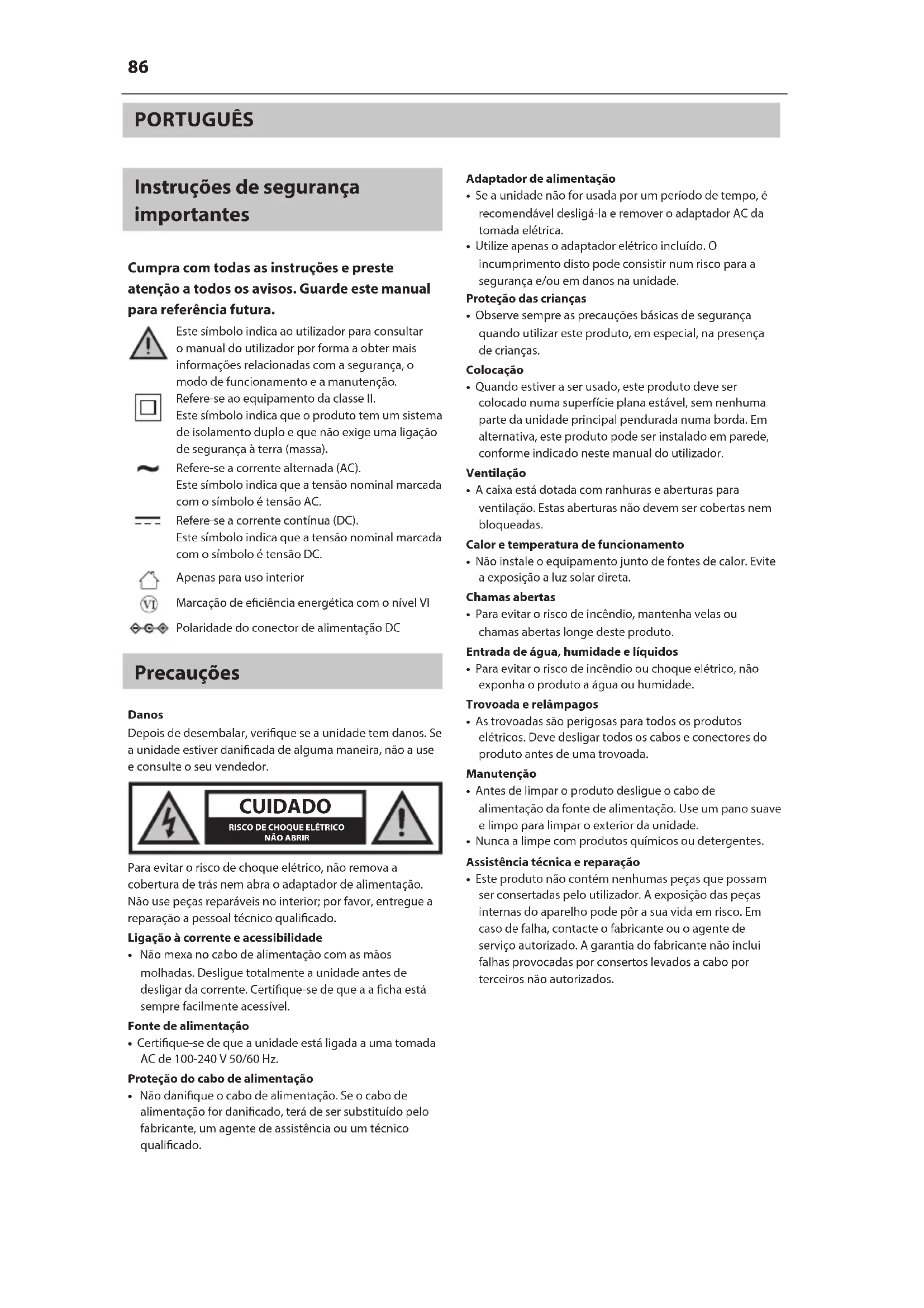 Este símbolo indica ao utilizador para consultar o manual do utilizador por forma a obter mais informações relacionadas com asegurança, o modo de funcionamento e a manutenção.Refere-se ao equipamento da classe II.Este símbolo indica que o produto tem um sistema de isolamento duplo e que não exige uma ligação de segurança à terra (massa).Refere-se a corrente alternada (AC).Este símbolo indica que a tensão nominal marcada com osímbolo é tensão AC.Refere-se a corrente contínua (DC). Este símbolo indica que a tensão nominal marcada com osímbolo é tensão DC.Apenas para uso interiorMarcação de eciência energética com o nível VIPolaridade do conector de alimentação DC Precauções DanosDepois de desembalar, verique se a unidade tem danos. Se a unidade estiver danicada de alguma maneira, não a use e consulte o seu vendedor. CUIDADO RISCO DE CHOQUE ELÉTRICONÃO ABRIRPara evitar o risco de choque elétrico, não remova a cobertura de trás nem abra o adaptador de alimentação. Não use peças reparáveis no interior; por favor, entregue a reparação a pessoal técnico qualicado.Ligação à corrente e acessibilidade