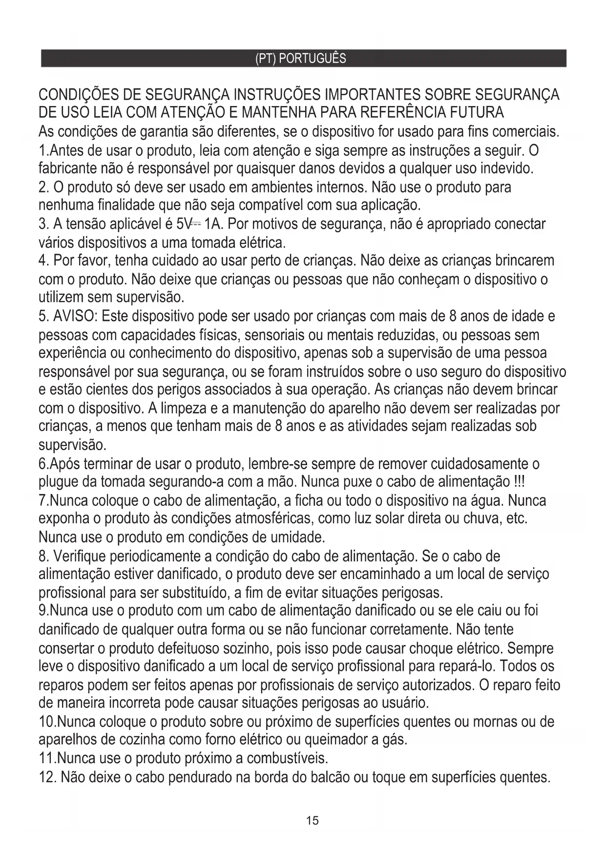 vários dispositivos a uma tomada elétrica. 7.Nunca coloque o cabo de alimentação, a ficha ou todo o dispositivo na água. Nunca exponha o produto às condições atmosféricas, como luz solar direta ou chuva, etc. Nunca use o produto em condições de umidade. CONDIÇÕES DE SEGURANÇA INSTRUÇÕES IMPORTANTES SOBRE SEGURANÇA DE USO LEIA COM ATENÇÃO E MANTENHA PARA REFERÊNCIA FUTURA As condições de garantia são diferentes, se o dispositivo for usado para fins comerciais. 1.Antes de usar o produto, leia com atenção e siga sempre as instruções a seguir. O fabricante não é responsável por quaisquer danos devidos a qualquer uso indevido.