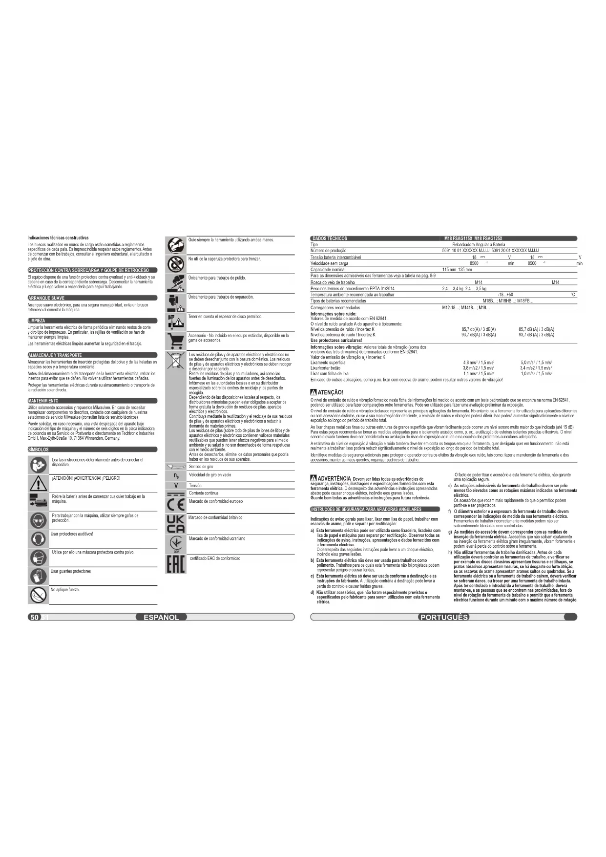 / Incertez K Lixamento superfi cial Lixar/cortar betão Lixar com folha de lixa ADVERTÊNCIA Devem ser lidas todas as advertências de segurança, instruções, ilustrações e especifi cações fornecidas com esta ferramenta elétrica. O desrespeito das advertências e instruções apresentadas abaixo pode causar choque elétrico, incêndio e/ou graves lesões. Guarde bem todas as advertências e instruções para futura referência. INSTRUÇÕES DE SEGURANÇA PARA AFIADORAS ANGULARES Indicações de aviso gerais para lixar, lixar com lixa de papel, trabalhar com escovas de arame, polir e separar por rectifi cação: a) Esta ferramenta eléctrica pode ser utilizada como lixadeira, lixadeira com lixa de papel e máquina para separar por rectifi cação. Observar todas as indicações de aviso, instruções, apresentações e dados fornecidos com a ferramenta eléctrica. O desrespeito das seguintes instruções pode levar a um choque eléctrico, incêndio e/ou graves lesões. b) Esta ferramenta elétrica não deve ser usada para trabalhos como polimento. Trabalhos para os quais esta ferramenta não foi projetada podem representar perigos e causar feridas. c) Esta ferramenta elétrica só deve ser usada conforme a destinação e as instruções do fabricante. A utilização contrária à destinação pode levar à perda do controlo e causar feridas graves. d) Não utilizar acessórios, que não foram especialmente previstos e especifi cados pelo fabricante para serem utilizados com esta ferramenta elétrica. O facto de poder fi xar o acessório a esta ferramenta elétrica, não garante uma aplicação segura. e) As rotações admissíveis da ferramenta de trabalho devem ser pelo menos tão elevadas como as rotações máximas indicadas na ferramenta eléctrica. Os acessórios que rodam mais rapidamente do que o permitido podem partir-se e ser projectados. f) O diâmetro exterior e a espessura da ferramenta de trabalho devem corresponder às indicações de medida da sua ferramenta eléctrica. Ferramentas de trabalho incorrectamente medidas podem não ser sufi cientemente blindadas nem controladas. g) As medidas do acessório devem corresponder com as medidas de inserção da ferramenta elétrica. Acessórios que não caibam exatamente na inserção da ferramenta elétrica giram irregularmente, vibram fortemente e podem levar à perda do controlo sobre a ferramenta. h) Não utilizar ferramentas de trabalho danifi cadas. Antes de cada utilização deverá controlar as ferramentas de trabalho, e verifi car se por exemplo os discos abrasivos apresentam fi ssuras e estilhaços, se pratos abrasivos apresentam fi ssuras, se há desgaste ou forte atrição, se as escovas de arame apresentam arames soltos ou quebrados. Se a ferramenta eléctrica ou a ferramenta de trabalho caírem, deverá verifi car se sofreram danos, ou trocar por uma ferramenta de trabalho intacta. Após ter controlado e introduzido a ferramenta de trabalho, deverá manter-se, e as pessoas que se encontrem nas proximidades, fora do nível de rotação da ferramenta de trabalho e permitir que a ferramenta eléctrica funcione durante um minuto com o máximo número de rotação. Em caso de outras aplicações, como p.ex. lixar com escova de arame, podem resultar outros valores de vibração! ATENÇÃO! O nível de emissão de ruído e vibração fornecido nesta fi cha de informações foi medido de acordo com um teste padronizado que se encontra na norma EN 62841, podendo ser utilizado para fazer comparações entre ferramentas. Pode ser utilizado para fazer uma avaliação preliminar da exposição. O nível de emissão de ruído e vibração declarado representa as principais aplicações da ferramenta. No entanto, se a ferramenta for utilizada para aplicações diferentes ou com acessórios distintos, ou se a sua manutenção for defi ciente, a emissão de ruídos e vibrações poderá diferir. Isso poderá aumentar signifi cativamente o nível de exposição ao longo do período de trabalho total. Ao lixar chapas metálicas fi nas ou outras estruturas de grande superfície que vibram facilmente pode ocorrer um nível sonoro muito maior do que indicado (até 15 dB). Para estas peças recomenda-se tomar as medidas adequadas para o isolamento acústico como, p. ex., a utilização de esteiras isolantes pesadas e fl exíveis. O nível sonoro elevado também deve ser considerado na avaliação do risco de exposição ao ruído e na escolha dos protetores auriculares adequados. A estimativa do nível de exposição à vibração e ruído também deve ter em conta os tempos em que a ferramenta, quer desligada quer em funcionamento, não está realmente a trabalhar. Isso poderá reduzir signifi cativamente o nível de exposição ao longo do período de trabalho total. Identifi que medidas de segurança adicionais para proteger o operador contra os efeitos da vibração e/ou ruído, tais como: fazer a manutenção da ferramenta e dos acessórios, manter as mãos quentes, organizar padrões de trabalho. Rebarbadora Angular a Bateria PORTUGUÊS Indicaciones técnicas constructivas Los huecos realizados en muros de carga están sometidos a reglamentos específi cos de cada país. Es imprescindible respetar estos reglamentos. Antes de comenzar con los trabajos, consultar el ingeniero estructural, el arquitecto o el jefe de obra. PROTECCIÓN CONTRA SOBRECARGA Y GOLPE DE RETROCESO El equipo dispone de una función protectora contra overload y anti-kickback y se detiene en caso de la correspondiente sobrecarga. Desconectar la herramienta eléctrica y luego volver a encenderla para seguir trabajando. ARRANQUE SUAVE Arranque suave electrónico, para una segura manejabilidad, evita un brusco retroceso al conectar la máquina. LIMPIEZA Limpiar la herramienta eléctrica de forma periódica eliminando restos de corte y otro tipo de impurezas. En particular, las rejillas de ventilación se han de mantener siempre limpias. Las herramientas eléctric