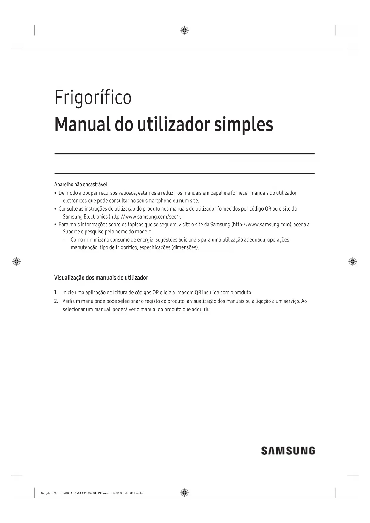 selecionar um manual, poderá ver o manual do produto que adquiriu. Simple_BMF_RB6000D_DA68-04780Q-01_PT.indd 1 2024-01-25 12:08:31Índice2 Português Índice Informações de segurança 3 Precauções de segurança importantes 4 Instruções sobre REEE 8 Guia de segurança 8 Instalação 10 Visão geral do frigorífico 10 Folga 11 Instalação passo a passo 12 Operações 14 SmartThings 14 Manutenção 16 Limpeza 16 Apêndice 17 Instrução de segurança 17 Instrução de instalação 17 Instrução de temperatura 17 Informações sobre o modelo e a encomenda de peças de substituição 19 Simple_BMF_RB6000D_DA68-04780Q-01_PT.indd 2 2024-01-25 12:08:313Informações de segurança Português Informações de segurança