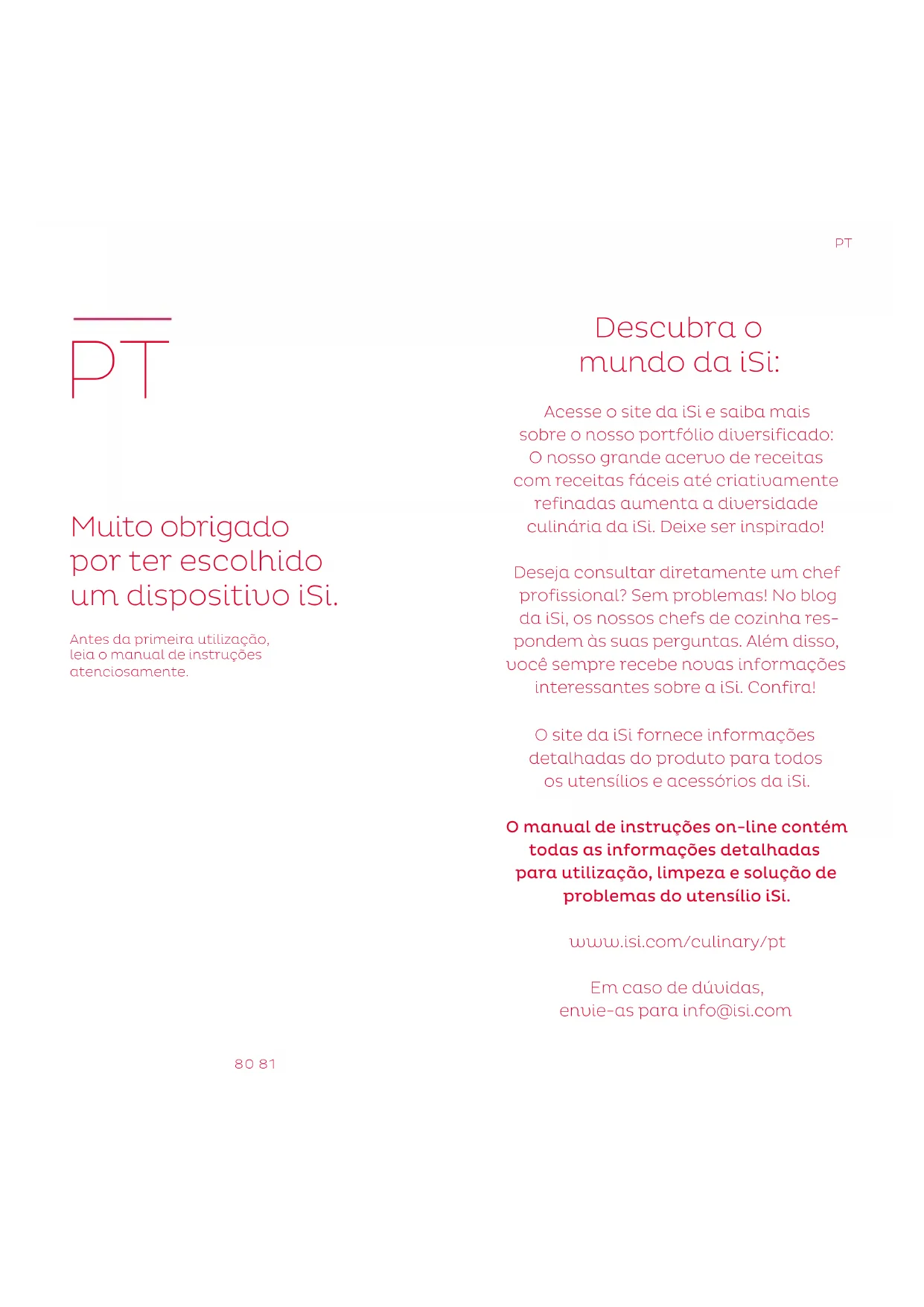 ——— ”Minska trycket”. Skicka apparaten till iSi eller ett serviceställe. Service. Reservdelar kan köpas separat och till förmån- liga priser. Kontakta din fackhandel, om du vill w beställa reservdelar. I Österrike går det bra via info@isi.com. Vid reparation ska hela apparaten skickas in.80 81 Descubra o mundo da iSi: Acesse o site da iSi e saiba mais sobre o nosso portfólio diversificado: O nosso grande acervo de receitas com receitas fáceis até criativamente refinadas aumenta a diversidade culinária da iSi. Deixe ser inspirado! Deseja consultar diretamente um chef profissional? Sem problemas! No blog da iSi, os nossos chefs de cozinha res- pondem às suas perguntas. Além disso, você sempre recebe novas informações interessantes sobre a iSi. Confira! O site da iSi fornece informações detalhadas do produto para todos os utensílios e acessórios da iSi. O manual de instruções on-line contém todas as informações detalhadas para utilização, limpeza e solução de problemas do utensílio iSi. www.isi.com/culinary/pt Em caso de dúvidas, envie-as para info@isi.com