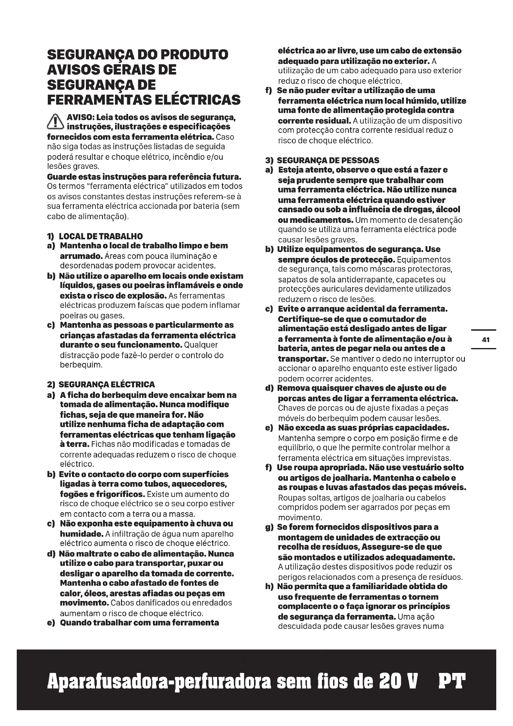 a) Esteja atento, observe o que está a fazer e seja prudente sempre que trabalhar com uma ferramenta eléctrica. Não utilize nunca uma ferramenta eléctrica quando estiver cansado ou sob a influência de drogas, álcool ou medicamentos. Um momento de desatenção quando se utiliza uma ferramenta eléctrica pode causar lesões graves. b) Utilize equipamentos de segurança. Use sempre óculos de protecção. Equipamentos de segurança, tais como máscaras protectoras, sapatos de sola antiderrapante, capacetes ou protecções auriculares devidamente utilizados reduzem o risco de lesões. c) Evite o arranque acidental da ferramenta. Certifique-se de que o comutador de alimentação está desligado antes de ligar a ferramenta à fonte de alimentação e/ou à bateria, antes de pegar nela ou antes de a transportar. Se mantiver o dedo no interruptor ou accionar o aparelho enquanto este estiver ligado podem ocorrer acidentes. d) Remova quaisquer chaves de ajuste ou de porcas antes de ligar a ferramenta eléctrica. Chaves de porcas ou de ajuste fixadas a peças móveis do berbequim podem causar lesões. e) Não exceda as suas próprias capacidades. Mantenha sempre o corpo em posição firme e de equilíbrio, o que lhe permite controlar melhor a ferramenta eléctrica em situações imprevistas. f) Use roupa apropriada. Não use vestuário solto ou artigos de joalharia. Mantenha o cabelo e as roupas e luvas afastados das peças móveis. Roupas soltas, artigos de joalharia ou cabelos compridos podem ser agarrados por peças em movimento. g) Se forem fornecidos dispositivos para a montagem de unidades de extracção ou recolha de resíduos, Assegure-se de que são montados e utilizados adequadamente. A utilização destes dispositivos pode reduzir os perigos relacionados com a presença de resíduos. h) Não permita que a familiaridade obtida do uso frequente de ferramentas o tornem complacente o o faça ignorar os princípios de segurança da ferramenta. Uma ação descuidada pode causar lesões graves numa42 Aparafusadora-perfuradora sem fios de 20 V