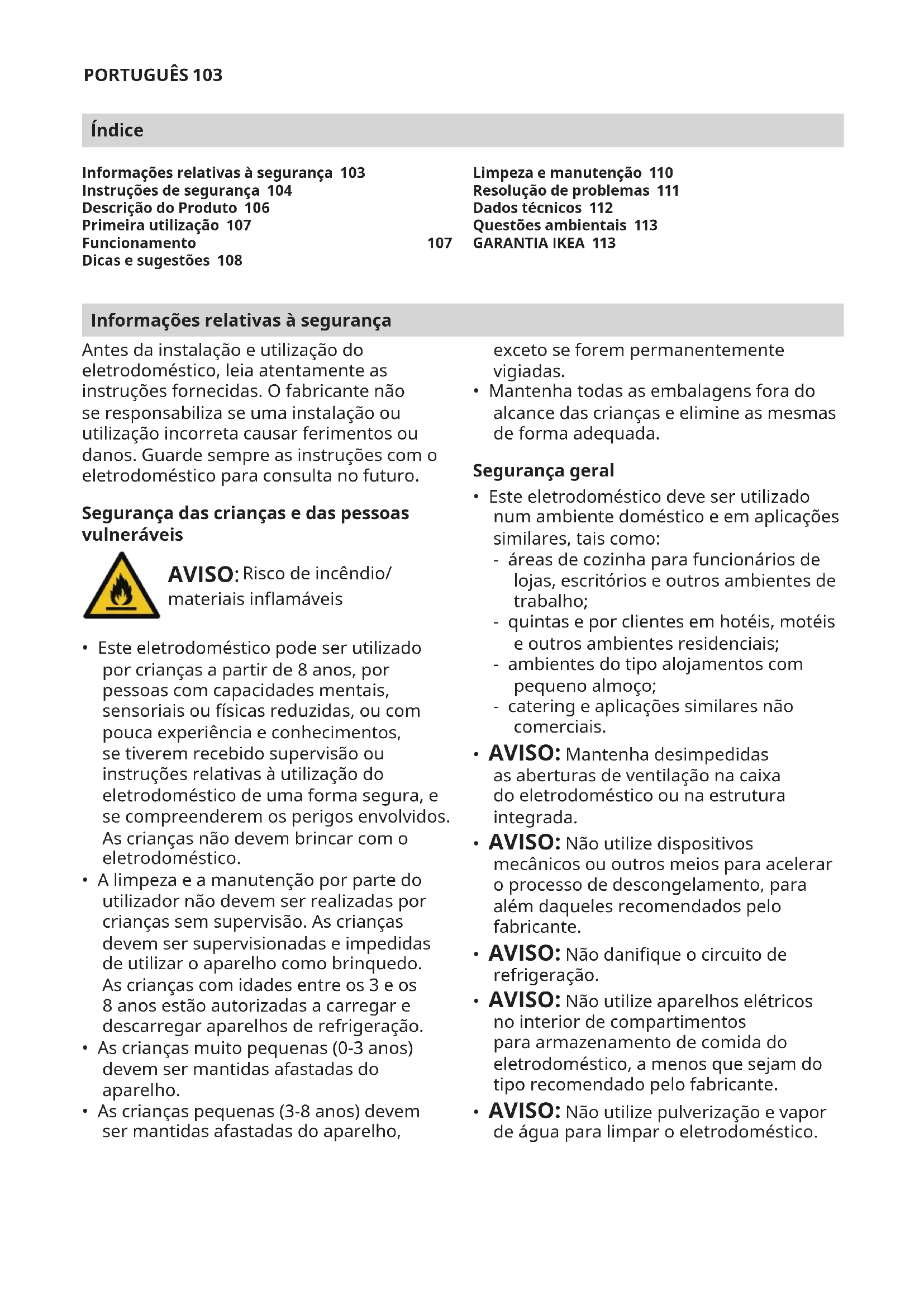 - solicitar um esclarecimento relativo às funcionalidades dos equipamentos IKEA. Para garantir que lhe proporcionamos a melhor assistência, por favor, antes de contactar connosco leia atentamente as Instruções de Instalação e/ou o Livro de Instruções de utilização. Como contactar-nos, se necessitar do nosso serviço? Pode encontrar os números de telefone dos fornecedores de serviços pós-venda designados pela IKEA no nal deste manual.PORTUGUÊS 115 Para lhe prestarmos um serviço mais rápido, recomendamos que utilize os números de telefone especícos indicados neste manual. Consulte sempre os números listados no manual do utilizador do eletrodoméstico especíco que necessite de assistência. Não se esqueça de indicar o número de artigo de 8 dígitos e o número de série de 22 dígitos indicados na placa de potência do seu aparelho. GUARDE A FATURA OU TALÃO DE COMPRA! É a sua prova de compra e será necessária para aplicar e validar a garantia. A fatura ou talão de compra indica igualmente o nome e o número de artigo (código de 8 dígitos) IKEA de cada equipamento que adquiriu. Necessita ajuda adicional? Para quaisquer esclarecimentos adicionais não relacionados com Pós-Venda sobre os seus equipamentos, por favor, contacte o callcenter da sua loja IKEA. Recomendamos que leia atentamente a documentação do equipamento antes de nos contactar. Informações sobre peças sobresselentes - As seguintes peças sobresselentes: termóstatos, sensores de temperatura, placas de circuito impresso e fontes de luz estarão disponíveis para reparadores prossionais durante um período mínimo de sete anos, após a colocação da última unidade do modelo no mercado. - As seguintes peças sobresselentes: puxadores de portas, dobradiças de portas, tabuleiros e cestos estarão disponíveis para reparadores prossionais e utilizadores nais durante um período mínimo de sete anos, e as juntas de portas durante um período mínimo de 10 anos, após a colocação da última unidade do modelo no mercado. As peças sobresselentes podem ser encontradas em: www.ikea.comESPAÑOL 116 Tabla de contenidos Información de seguridad Antes de instalar y utilizar el aparato, lea atentamente las instrucciones facilitadas. El fabricante no se hace responsable de los daños o lesiones provocados por una mala instalación o uso. Guarde siempre las instrucciones junto con el aparato para futuras consultas. Seguridad de niños y personas vulnerables ADVERTENCIA: Riesgo de incendio/materiales inamables
