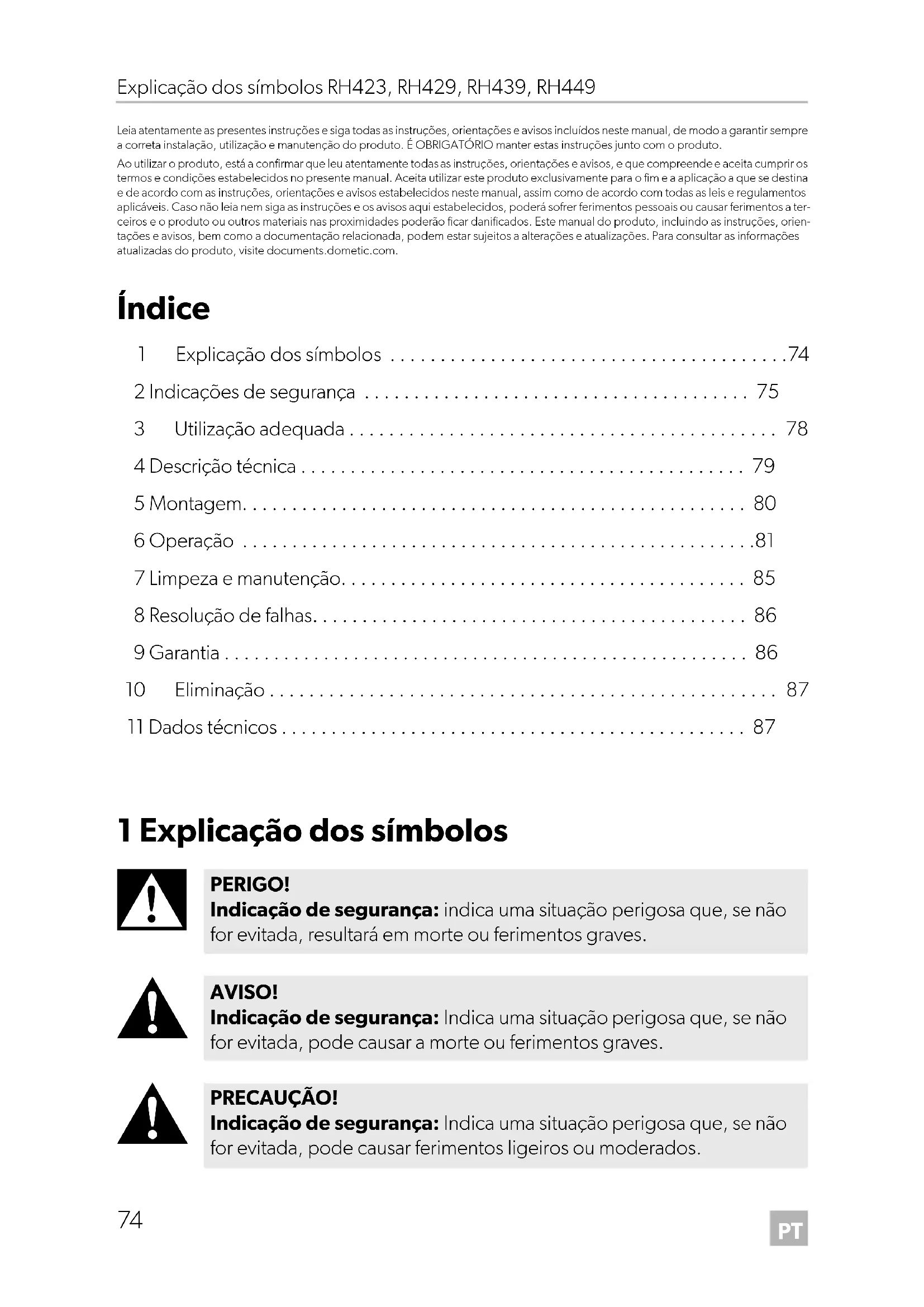 - Leia atentamente as presentes instruções e siga todas as instruções, orientações e avisos incluídos neste manual, de modo a garantir sempre a correta instalação, utilização e manutenção do produto. É OBRIGATÓRIO manter estas instruções junto com o produto. Ao utilizar o produto, está a confirmar que leu atentamente todas as instruções, orientações e avisos, e que compreende e aceita cumprir os termos e condições estabelecidos no presente manual. Aceita utilizar este produto exclusivamente para o fim e a aplicação a que se destina e de acordo com as instruções, orientações e avisos estabelecidos neste manual, assim como de acordo com todas as leis e regulamentos aplicáveis. Caso não leia nem siga as instruções e os avisos aqui estabelecidos, poderá sofrer ferimentos pessoais ou causar ferimentos a ter- ceiros e o produto ou outros materiais nas proximidades poderão ficar danificados. Este manual do produto, incluindo as instruções, orien- tações e avisos, bem como a documentação relacionada, podem estar sujeitos a alterações e atualizações. Para consultar as informações atualizadas do produto, visite documents.dometic.com. Índice 1 Explicação dos símbolos p. 74
