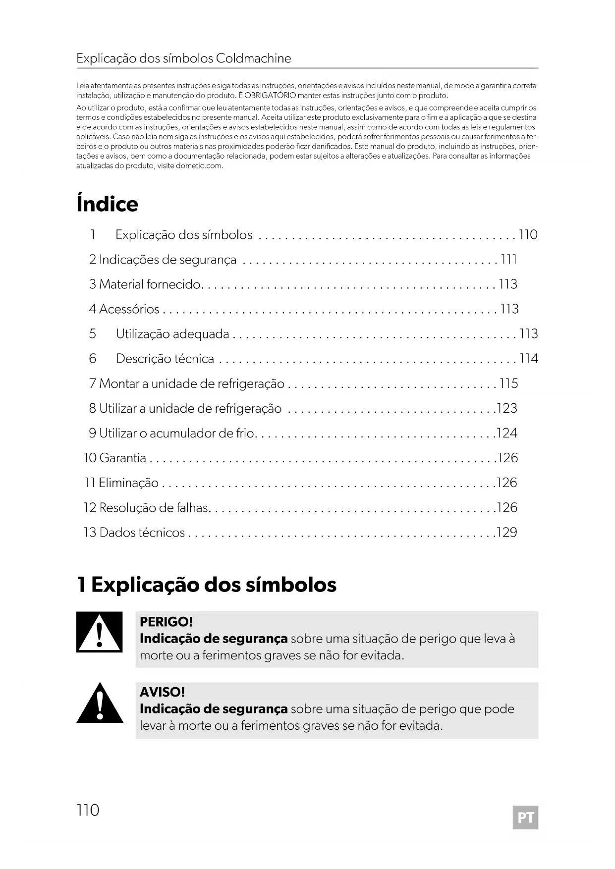 PERIGO! Indicação de segurança sobre uma situação de perigo que leva à morte ou a ferimentos graves se não for evitada. AVISO! Indicação de segurança sobre uma situação de perigo que pode levar à morte ou a ferimentos graves se não for evitada. DometicColdMachine50-54-55-84-85-86-94-95-96-CS-NC15_IOM_4445100001_EMEA16_20xx-xx-xx.book Page 110 Tuesday, May 4, 2021 7:24 PMPT Coldmachine Indicações de segurança
