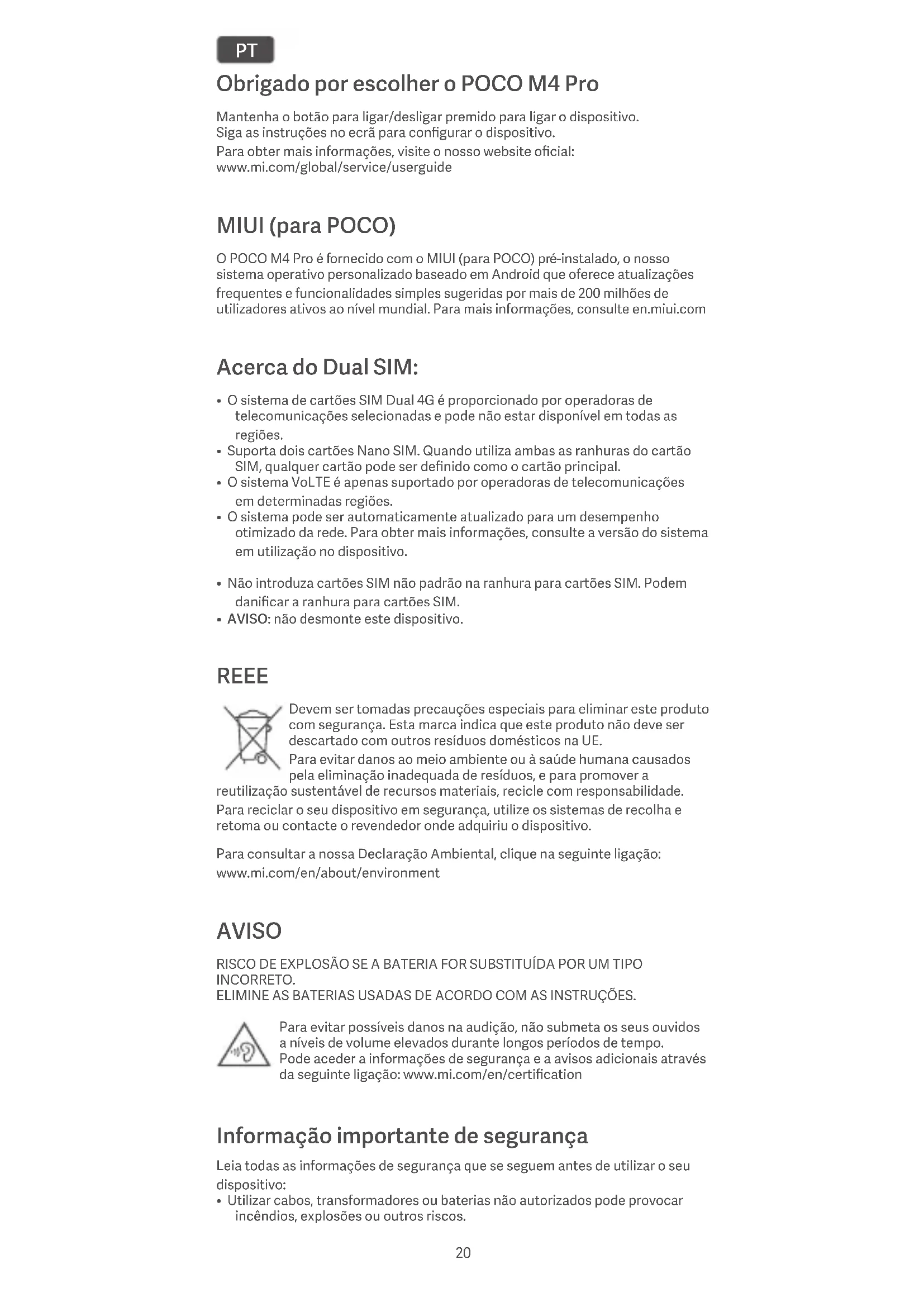- AVISO: não desmonte este dispositivo. REEE Devem ser tomadas precauções especiais para eliminar este produto com segurança. Esta marca indica que este produto não deve ser descartado com outros resíduos domésticos na UE. Para evitar danos ao meio ambiente ou à saúde humana causados pela eliminação inadequada de resíduos, e para promover a reutilização sustentável de recursos materiais, recicle com responsabilidade. Para reciclar o seu dispositivo em segurança, utilize os sistemas de recolha e retoma ou contacte o revendedor onde adquiriu o dispositivo. Para consultar a nossa Declaração Ambiental, clique na seguinte ligação: www.mi.com/en/about/environment AVISO RISCO DE EXPLOSÃO SE A BATERIA FOR SUBSTITUÍDA POR UM TIPO INCORRETO. ELIMINE AS BATERIAS USADAS DE ACORDO COM AS INSTRUÇÕES. Para evitar possíveis danos na audição, não submeta os seus ouvidos a níveis de volume elevados durante longos períodos de tempo. Pode aceder a informações de segurança e a avisos adicionais através da seguinte ligação: www.mi.com/en/certification Informação importante de segurança Leia todas as informações de segurança que se seguem antes de utilizar o seu dispositivo: