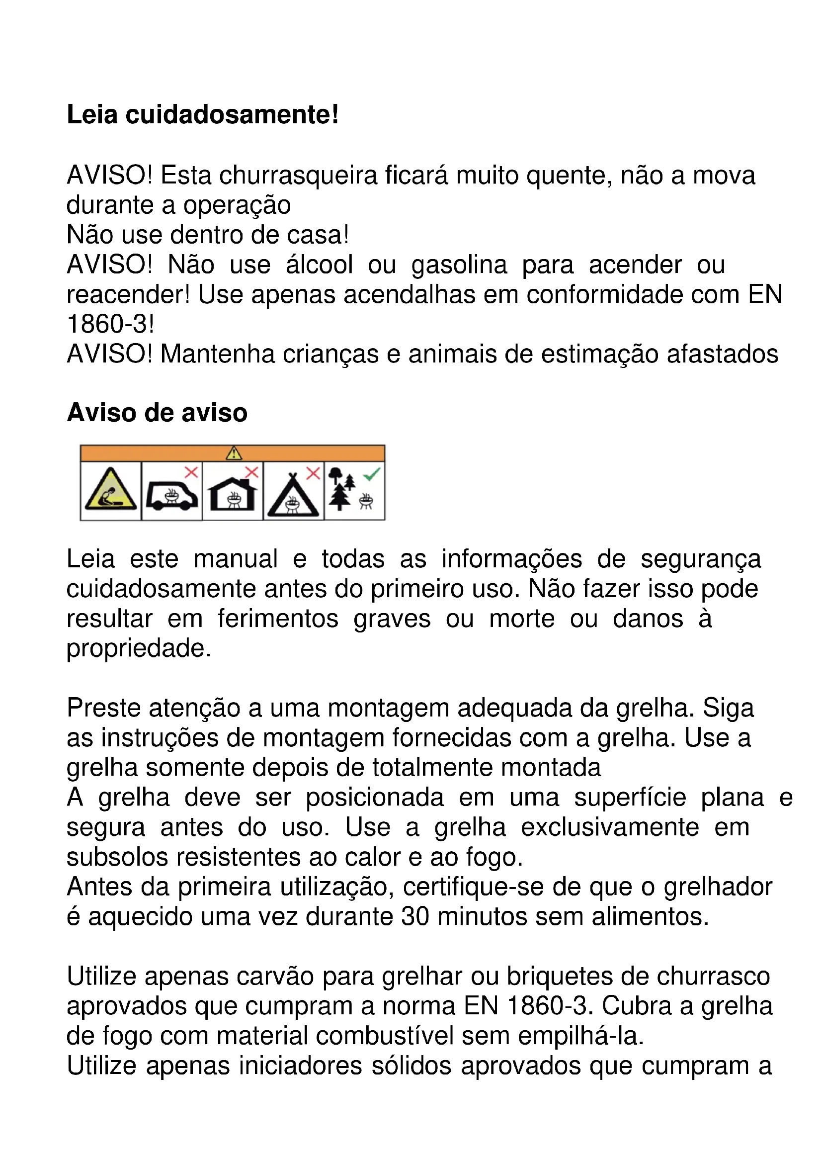 KLeia cuidadosamente! AVISO! Esta churrasqueira ficará muito quente, não a mova durante a operação Não use dentro de casa! AVISO! Não use álcool ou gasolina para acender ou reacender! Use apenas acendalhas em conformidade com EN 1860-3! AVISO! Mantenha crianças e animais de estimação afastados Aviso de aviso