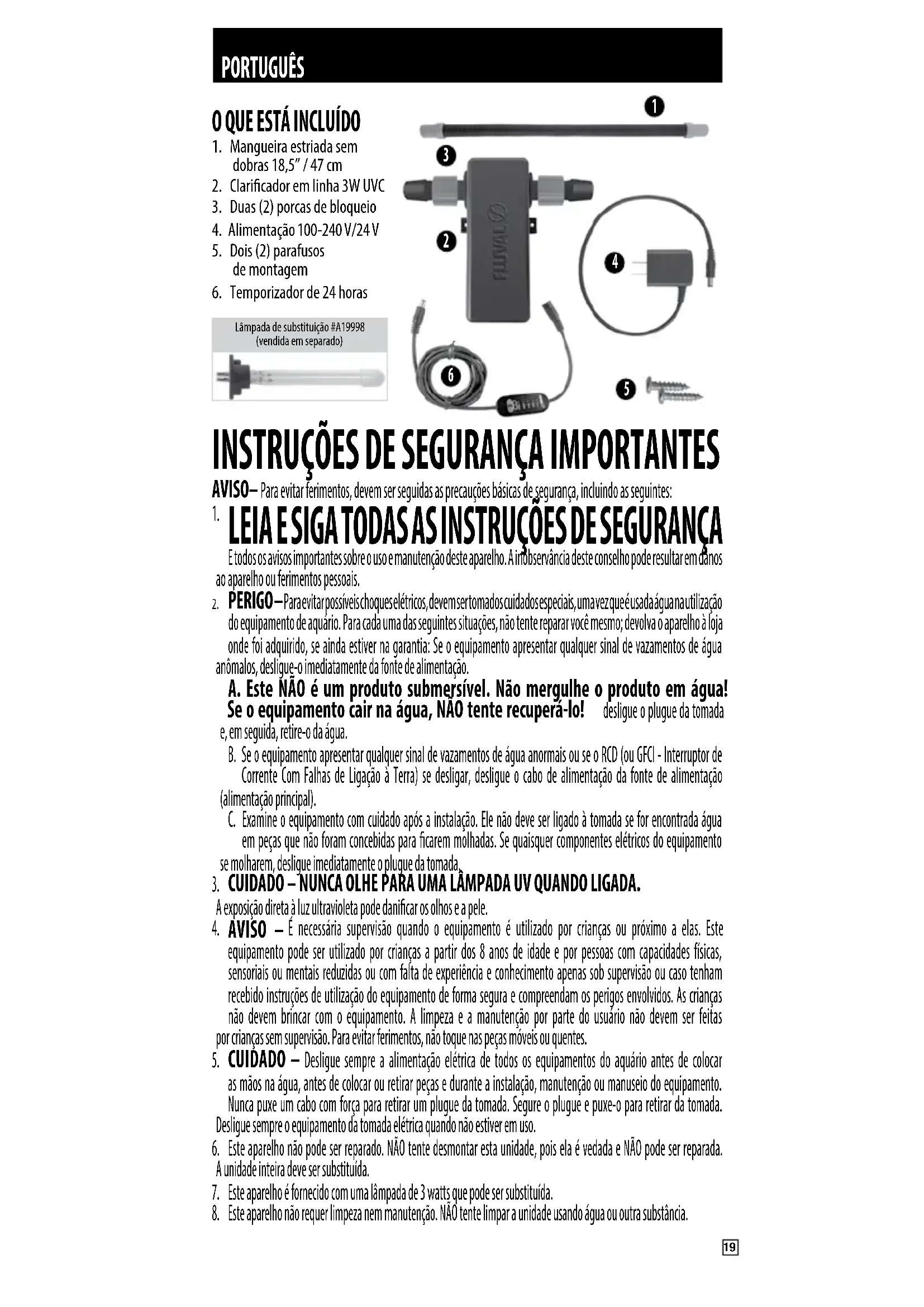 - PERIGO—Para evitar possessivechoqueselétricos, devemsertomadoscuidadosespecialis, uma vezqueéusadaáguanutilização do equipamento de aquário. Para cada uma das següntes situações, não tente reparar você mesmo; devolver o aparelho à loja onde foi adquirido, se acreda estiver na garantia: Se o equipamento aparecer qualquer sinal de vizamentos de água anomalos, deslque-o imeditamente da fonte de alimentação.
