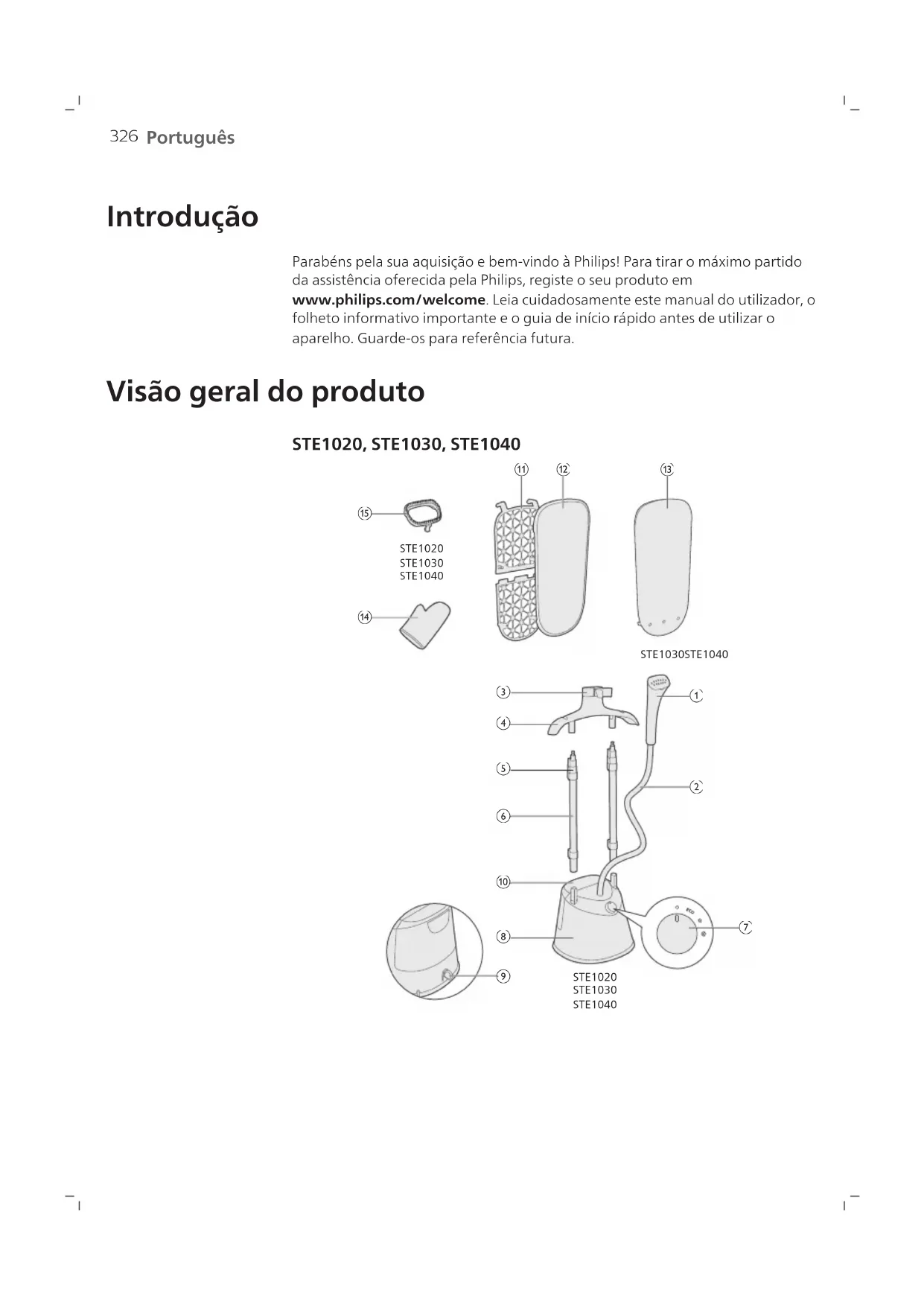 1 Bocal do vaporizador 2 Mangueira de fornecimento de vapor 3 Base para o vaporizador 4 Cabide (STE1011, STE1020, STE1030, STE1040) 5 Hastes do clipe de travamento 6 Haste 7 Botão de vapor 8 Base 9 Botão de remoção de impurezas 10 Reservatório de água344 Português do Brasil 11 Tábua de passar (STE1040) 12 Capa (STE1040) 13 Apoio (STE1030) 14 Luva 15 Escova (STE1020, STE1030, STE1040) Preparação para o uso Tipo de água usado O aparelho é adequado para uso com água corrente. No entanto, se você mora em uma área com água dura, recomendamos misturar uma quantidade igual de água da torneira com água destilada ou desmineralizada. Isso evitará o acúmulo rápido de impurezas e prolongará a vida útil do aparelho. Não adicione perfume, água da secadora, vinagre, amido, agentes removedores de impurezas, produtos para passar roupas, água quimicamente descalcificada ou outros produtos químicos, pois podem causar jatos de água, manchas escuras ou danos ao aparelho. Avisos 1 Não coloque qualquer parte da pele em contato direto com o vapor. 2 Não aponte a placa de vapor para outras pessoas.345 Português do Brasil 3 Não segure a peça de roupa de forma que esteja em contato direto com o vapor. 4 Não utilize o bocal do vaporizador apontado para baixo. 5 Não dobre a mangueira para vaporizar a peça de roupa. > 5 min. 6 Não deixe a vaporizador vertical sem supervisão por mais de 5minutos.346 Português do Brasil