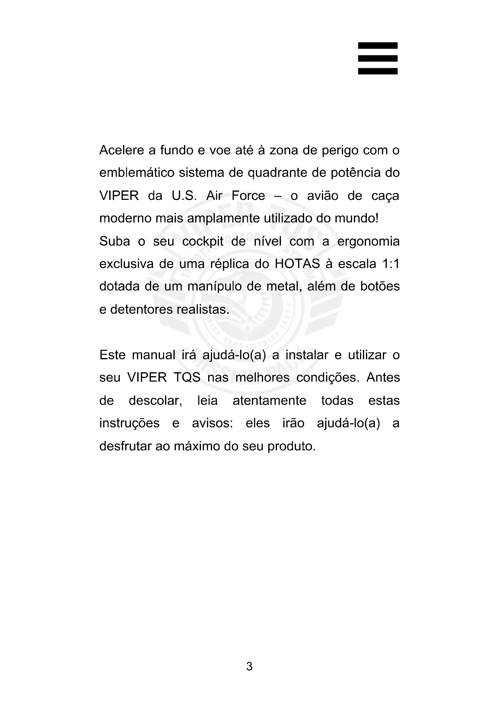 Acelere a fundo e voe até à zona de perigo com o emblemático sistema de quadrante de potência do VIPER da U.S. Air Force – o avião de caça moderno mais amplamente utilizado do mundo! Suba o seu cockpit de nível com a ergonomia exclusiva de uma réplica do HOTAS à escala 1:1 dotada de um manípulo de metal, além de botões e detentores realistas. Este manual irá ajudá-lo(a) a instalar e utilizar o seu VIPER TQS nas melhores condições. Antes de descolar, leia atentamente todas estas instruções e avisos: eles irão ajudá-lo(a) a desfrutar ao máximo do seu produto.4