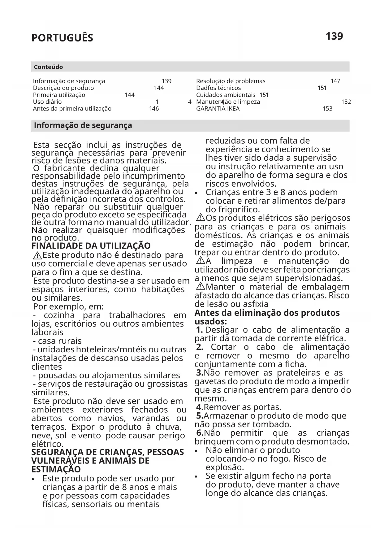 Informação de segurança 139 Descrição do produto 144 Primeira utilização 144 Uso diário 144 Antes da primeira utilização 146 Conteúdo Resolução de problemas 147 Dadfos técnicos 151 Cuidados ambientais 151 Manutenção e limpeza 152 GARANTIA IKEA 153 Informação de segurança Esta secção inclui as instruções de segurança necessárias para prevenir risco de lesões e danos materiais. O fabricante declina qualquer responsabilidade pelo incumprimento destas instruções de segurança, pela utilização inadequada do aparelho ou pela definição incorreta dos controlos. Não reparar ou substituir qualquer peça do produto exceto se especificada de outra forma no manual do utilizador. Não realizar quaisquer modificações no produto.