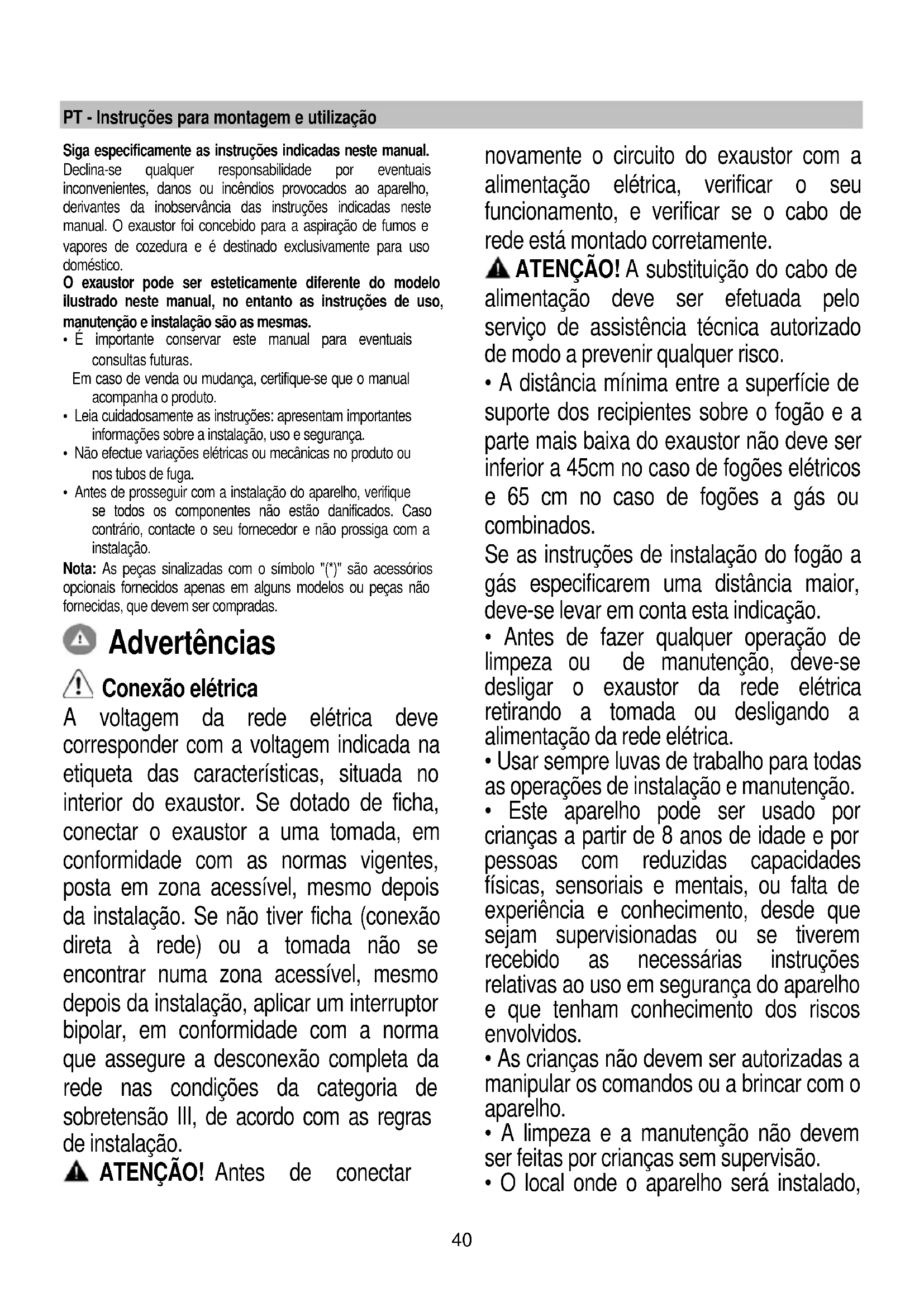 - Antes de prosseguir com a instalação do aparelho, verifique se todos os componentes não estão danificados. Caso contrário, contacte o seu fornecedor e não prossiga com a instalação. Nota: As peças sinalizadas com o símbolo "(*)" são acessórios opcionais fornecidos apenas em alguns modelos ou peças não fornecidas, que devem ser compradas. Advertências Conexão elétrica A voltagem da rede elétrica deve corresponder com a voltagem indicada na etiqueta das características, situada no interior do exaustor. Se dotado de ficha, conectar o exaustor a uma tomada, em conformidade com as normas vigentes, posta em zona acessível, mesmo depois da instalação. Se não tiver ficha (conexão direta à rede) ou a tomada não se encontrar numa zona acessível, mesmo depois da instalação, aplicar um interruptor bipolar, em conformidade com a norma que assegure a desconexão completa da rede nas condições da categoria de sobretensão III, de acordo com as regras de instalação. ATENÇÃO! Antes de conectar novamente o circuito do exaustor com a alimentação elétrica, verificar o seu funcionamento, e verificar se o cabo de rede está montado corretamente. ATENÇÃO! A substituição do cabo de alimentação deve ser efetuada pelo serviço de assistência técnica autorizado de modo a prevenir qualquer risco.