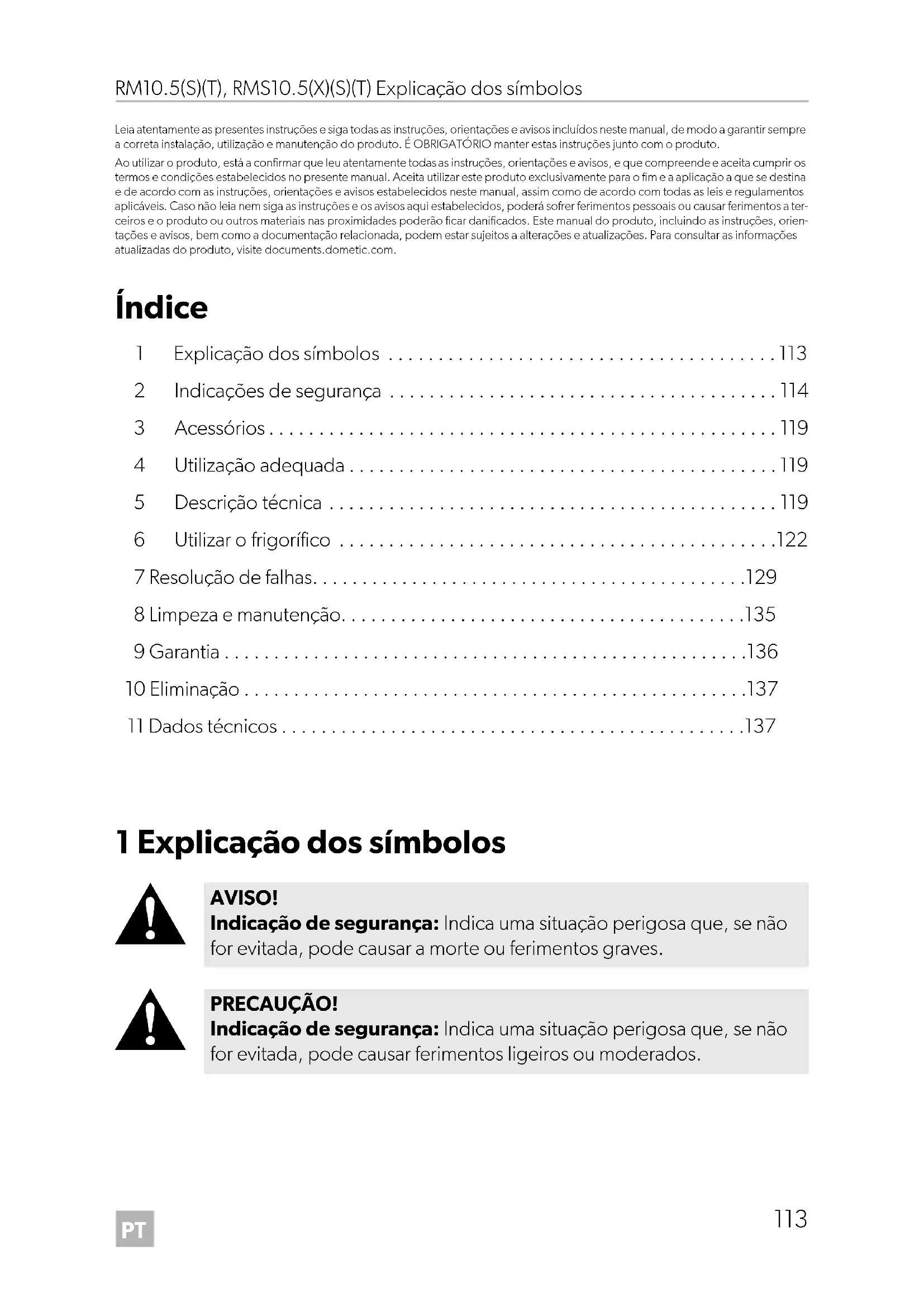 - Leia atentamente as presentes instruções e siga todas as instruções, orientações e avisos incluídos neste manual, de modo a garantir sempre a correta instalação, utilização e manutenção do produto. É OBRIGATÓRIO manter estas instruções junto com o produto. Ao utilizar o produto, está a confirmar que leu atentamente todas as instruções, orientações e avisos, e que compreende e aceita cumprir os termos e condições estabelecidos no presente manual. Aceita utilizar este produto exclusivamente para o fim e a aplicação a que se destina e de acordo com as instruções, orientações e avisos estabelecidos neste manual, assim como de acordo com todas as leis e regulamentos aplicáveis. Caso não leia nem siga as instruções e os avisos aqui estabelecidos, poderá sofrer ferimentos pessoais ou causar ferimentos a ter- ceiros e o produto ou outros materiais nas proximidades poderão ficar danificados. Este manual do produto, incluindo as instruções, orien- tações e avisos, bem como a documentação relacionada, podem estar sujeitos a alterações e atualizações. Para consultar as informações atualizadas do produto, visite documents.dometic.com. Índice 1 Explicação dos símbolos p. 113