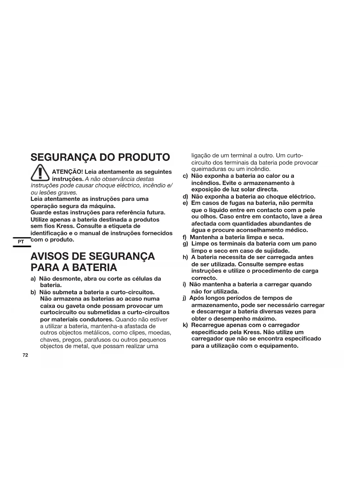 ATENÇÃO! Leia atentamente as seguintes instruções. A não observância destas instruções pode causar choque eléctrico, incêndio e/ ou lesões graves. Leia atentamente as instruções para uma operação segura da máquina. Guarde estas instruções para referência futura. Utilize apenas a bateria destinada a produtos sem fios Kress. Consulte a etiqueta de identificação e o manual de instruções fornecidos com o produto.