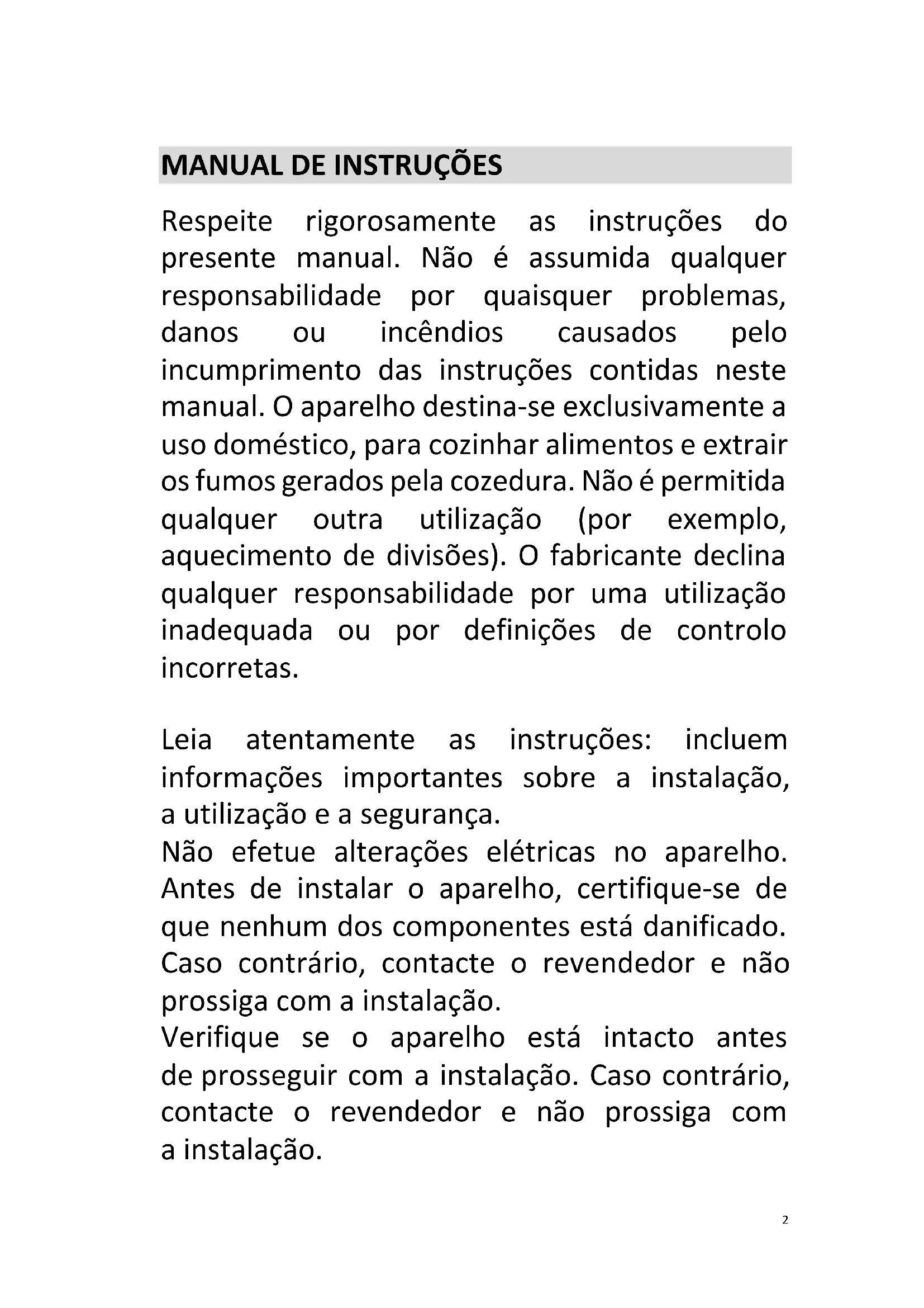 Respeite rigorosamente as instruções do presente manual. Não é assumida qualquer responsabilidade por quaisquer problemas, danos ou incêndios causados pelo incumprimento das instruções contidas neste manual. O aparelho destina-se exclusivamente a uso doméstico, para cozinhar alimentos e extrair os fumos gerados pela cozedura. Não é permitida qualquer outra utilização (por exemplo, aquecimento de divisões). O fabricante declina qualquer responsabilidade por uma utilização inadequada ou por definições de controlo incorretas. Leia atentamente as instruções: incluem informações importantes sobre a instalação, a utilização e a segurança. Não efetue alterações elétricas no aparelho. Antes de instalar o aparelho, certifique-se de que nenhum dos componentes está danificado. Caso contrário, contacte o revendedor e não prossiga com a instalação. Verifique se o aparelho está intacto antes de prosseguir com a instalação. Caso contrário, contacte o revendedor e não prossiga com a instalação.3