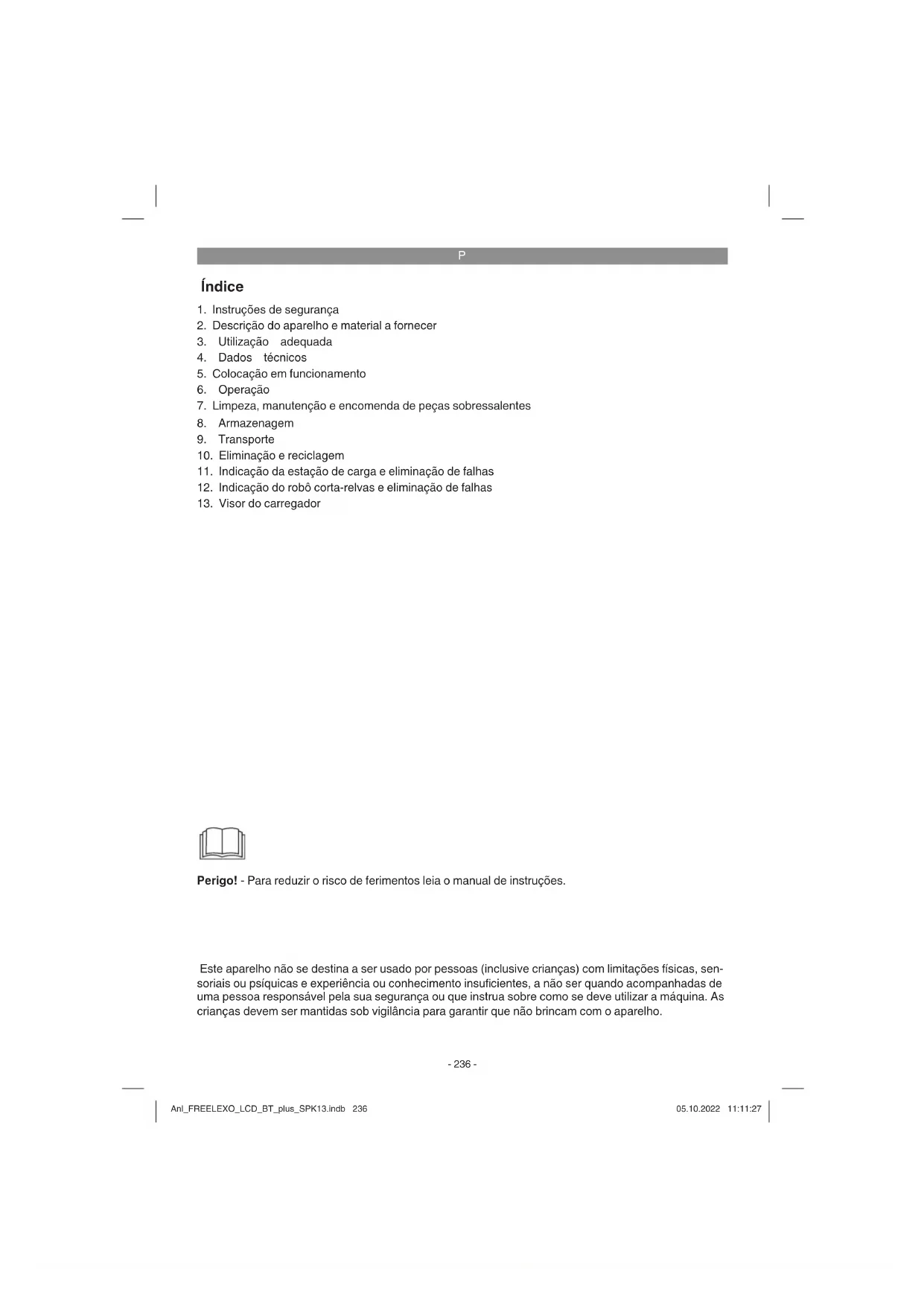 Perigo! - Para reduzir o risco de ferimentos leia o manual de instruções. Este aparelho não se destina a ser usado por pessoas (inclusive crianças) com limitações físicas, sen- soriais ou psíquicas e experiência ou conhecimento insufi cientes, a não ser quando acompanhadas de uma pessoa responsável pela sua segurança ou que instrua sobre como se deve utilizar a máquina. As crianças devem ser mantidas sob vigilância para garantir que não brincam com o aparelho. Anl_FREELEXO_LCD_BT_plus_SPK13.indb 236Anl_FREELEXO_LCD_BT_plus_SPK13.indb 236 05.10.2022 11:11:2705.10.2022 11:11:27P