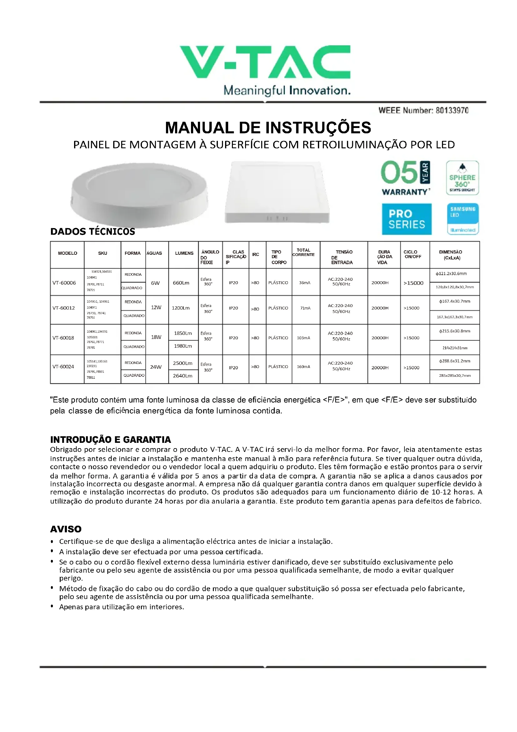 Obrigado por selecionar e comprar o produto V-TAC. A V-TAC irá servi-lo da melhor forma. Por favor, leia atentamente estas instruções antes de iniciar a instalação e mantenha este manual à mão para referência futura. Se tiver qualquer outra dúvida, contacte o nosso revendedor ou o vendedor local a quem adquiriu o produto. Eles têm formação e estão prontos para o servir da melhor forma. A garantia é válida por 5 anos a partir da data de compra. A garantia não se aplica a danos causados por instalação incorrecta ou desgaste anormal. A empresa não dá qualquer garantia contra danos em qualquer superfície devido à remoção e instalação incorrectas do produto. Os produtos são adequados para um funcionamento diário de 10-12 horas. A utilização do produto durante 24 horas por dia anularia a garantia. Este produto tem garantia apenas para defeitos de fabrico.