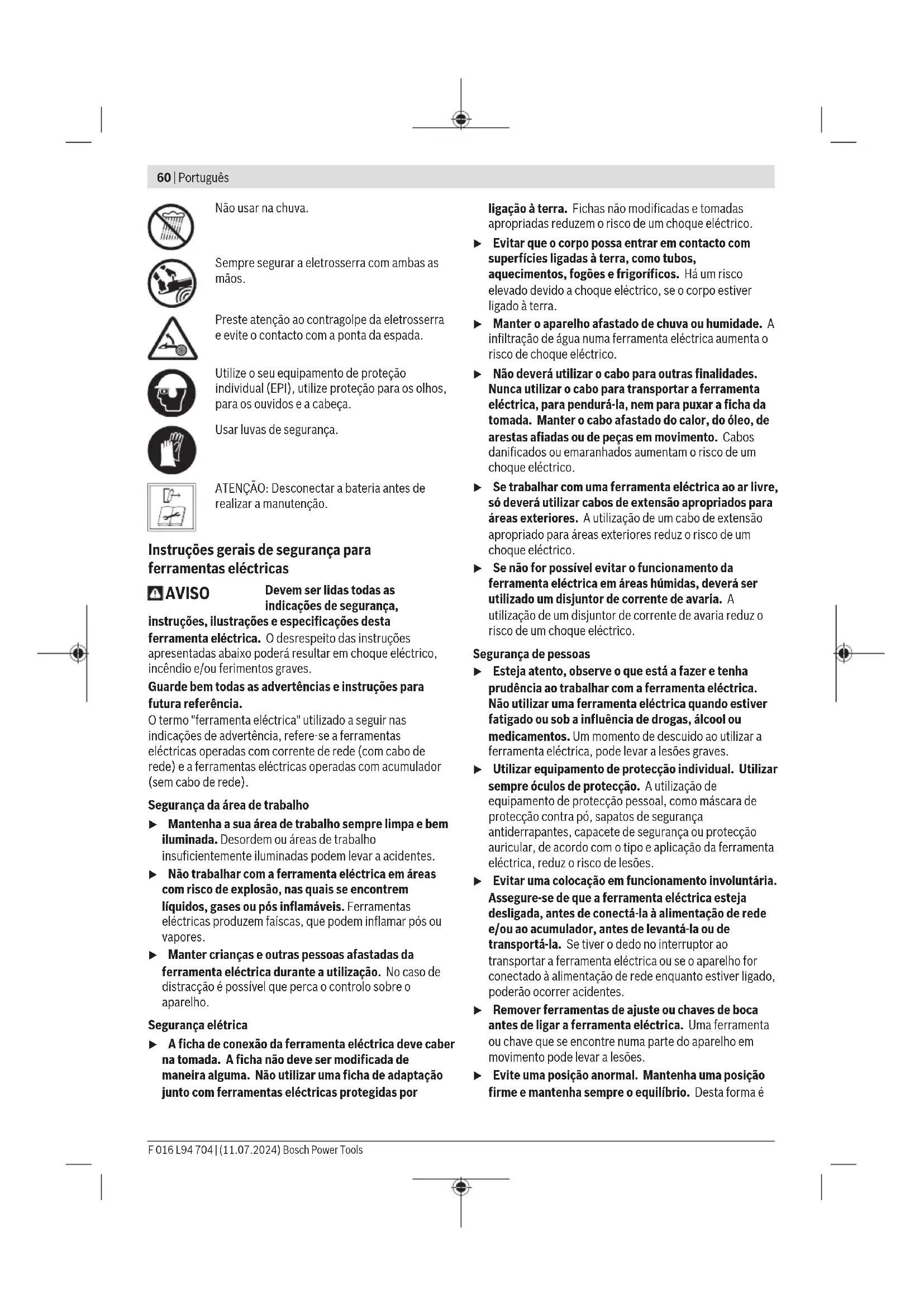 1,5 O(s) valor(es) total(ais) de vibração e o(s) valor(es) especificado(s) de emissão de ruído devem ter sido medidos de acordo com um método de teste padronizado e podem ser usadospara comparar uma ferramenta elétrica com outra. O(s) valor(es) total(ais) de vibração e o(s) valor(es) especificado(s) de emissão de ruído também podem ser usados para uma avaliação preliminar da exposição. Que as emissões de vibração e ruído durante o uso real da ferramenta elétrica podem diferir dos valores declarados, dependendo da forma como a ferramenta elétrica é usada, em particular do tipo de peça a ser usinada; e a necessidade de estabelecer medidas de segurança para proteger o operador, com base em uma estimativa da exposição à vibração durante as condições reais de uso (levando em consideração todas as partes do ciclo de trabalho, como os momentos em que a ferramenta elétrica está desligada e os momentos em que está ligada é, mas roda sem carga). Bateria Bosch vende ferramentas elétricas sem fio também sem bateria. Pode consultar na embalagem se está incluída uma bateria no volume de fornecimento da sua ferramenta elétrica. Carregar a bateria u Utilize apenas os carregadores listados nos dados técnicos. Só estes carregadores são apropriados para os baterias de lítio utilizadas para a sua ferramenta elétrica. Nota: devido a normas de transporte internacionais, as baterias de lítio são fornecidas parcialmente carregadas. Para assegurar a completa potência da bateria, a bateria deverá ser carregada completamente antes da primeira utilização. Colocar a bateria Insira a bateria carregada no respetivo encaixe, até que esta esteja engatada. Retirar a bateria Para retirar a bateria, pressione a respetiva tecla de desbloqueio e puxe a bateria para fora. Não empregue força. A bateriapossui 2 níveis de travamento, que devem evitar, que a bateria caia, caso a tecla de desbloqueio da bateriaseja premida por acaso. Enquanto a bateria estiver dentro da ferramenta elétrica, ela é mantida em posição por uma mola. Bosch Power Tools F 016 L94 704 | (11.07.2024)66 | Português Indicador do nível de carga da bateria Os LEDs verdes do indicador do nível de carga da bateria indicam o nível de carga da bateria. Por motivos de segurança, a consulta do nível de carga só é possível com a ferramenta elétrica parada. Prima a tecla para o indicador do nível de carga da bateria ou para visualizar o nível de carga. Isto também é possível com a bateria removida. Se, depois de premir a tecla para o indicador do nível de carga da bateria, não se acender qualquer LED, a bateria tem defeito e tem de ser substituída. Tipo de bateria GBA 18V... LED Capacidade Luz permanente 3× verde 60–100% Luz permanente 2× verde 30–60% Luz permanente 1× verde 5–30% Luz intermitente 1× verde 0–5% Tipo de bateria ProCORE18V... LED Capacidade Luz permanente 5× verde 80–100% Luz permanente 4× verde 60–80% Luz permanente 3× verde 40–60% Luz permanente 2× verde 20–40% Luz permanente 1× verde 5–20% Luz intermitente 1× verde 0–5% Indicações sobre o manuseio ideal da bateria Proteger a bateria contra humidade e água. Armazene a bateria apenas na faixa de temperatura de −20°C a 50°C. Por exemplo, não deixe a bateria dentro do automóvel no verão. Limpar de vez em quando as aberturas de ventilação da bateria com um pincel macio, limpo e seco. Um tempo de funcionamento reduzido após o carregamento indica que a bateria está gasta e que deve ser substituída. Observe as indicações sobre a eliminação de forma ecológica. Tratamento do acumulador Para assegurar a utilização otimizada do acumulador, deverá observar as seguintes indicações e medidas: – Proteger o acumulador contra humidade e água. – Armazene a ferramenta elétrica e a bateria apenas na faixa de temperatura de -20°C a 50°C. Não deixe a bateria, por ex., dentro do carro no verão. – Armazenar o acumulador separadamente e não no aparelho de jardinagem. – Não deixe o acumulador dentro do aparelho de jardinagem, em caso de radiação solar direta. – A temperatura ideal para a arrecadação do acumulador é de 5 °C. – Limpar de vez em quando as aberturas de ventilação do acumulador com um pincel macio, limpo e seco. Um período de funcionamento reduzido após o carregamento, indica que o acumulador está gasto e que deve ser substituído. Montagem Para sua segurança u Atenção! Desligar a ferramenta elétrica e remover a bateria antes de todos os trabalhos de manutenção e de limpeza. u Cuidado! A corrente é afiada. Use sempre luvas de proteção ao trabalhar com a corrente. u A eletrosserra não deve jamais ser operada perto de outras pessoas, crianças ou animais, e também não após o consumo de álcool, drogas ou de medicamentos entorpecentes. u Utilize a eletrosserra apenas se a cobertura estiver corretamente fixada com as cavilhas de fixação (8) .. Montagem da barra e tensionamento da corrente da serra (ver figurasB1 – B4) u Cuidado! Não tensione a corrente da serra quando ela estiver quente. – Coloque a eletrosserra, com a cobertura (14) voltada para cima, sobre uma superfície plana adequada. – Remova a cobertura (14), retirando as duas porcas de fixação (15) usando a ferramenta de montagem (13) fornecida. – Segure a barra (11) com a ponta verticalmente para cima e fixe uma nova correne ou uma afiada (12) na direção correta na barra (ver figura B1). – Ajuste a cavilha de guia (10) para a esquerda, girando o parafuso de tensionamento da corrente (7) no sentido anti-horário. Nota: A barra não caberá na eletrosserra se a cavilha de guia (10) não estiver corretamente alinhada. – Certifique-se de que a corrente da serra (12) esteja corretamente posicionada na ranhura ao redor de toda a barra. – Coloque a corrente da serra em volta da roda dentada (3) e empurre a barra (11) sobre as cavilhas de fixação (8). – Coloque a cober