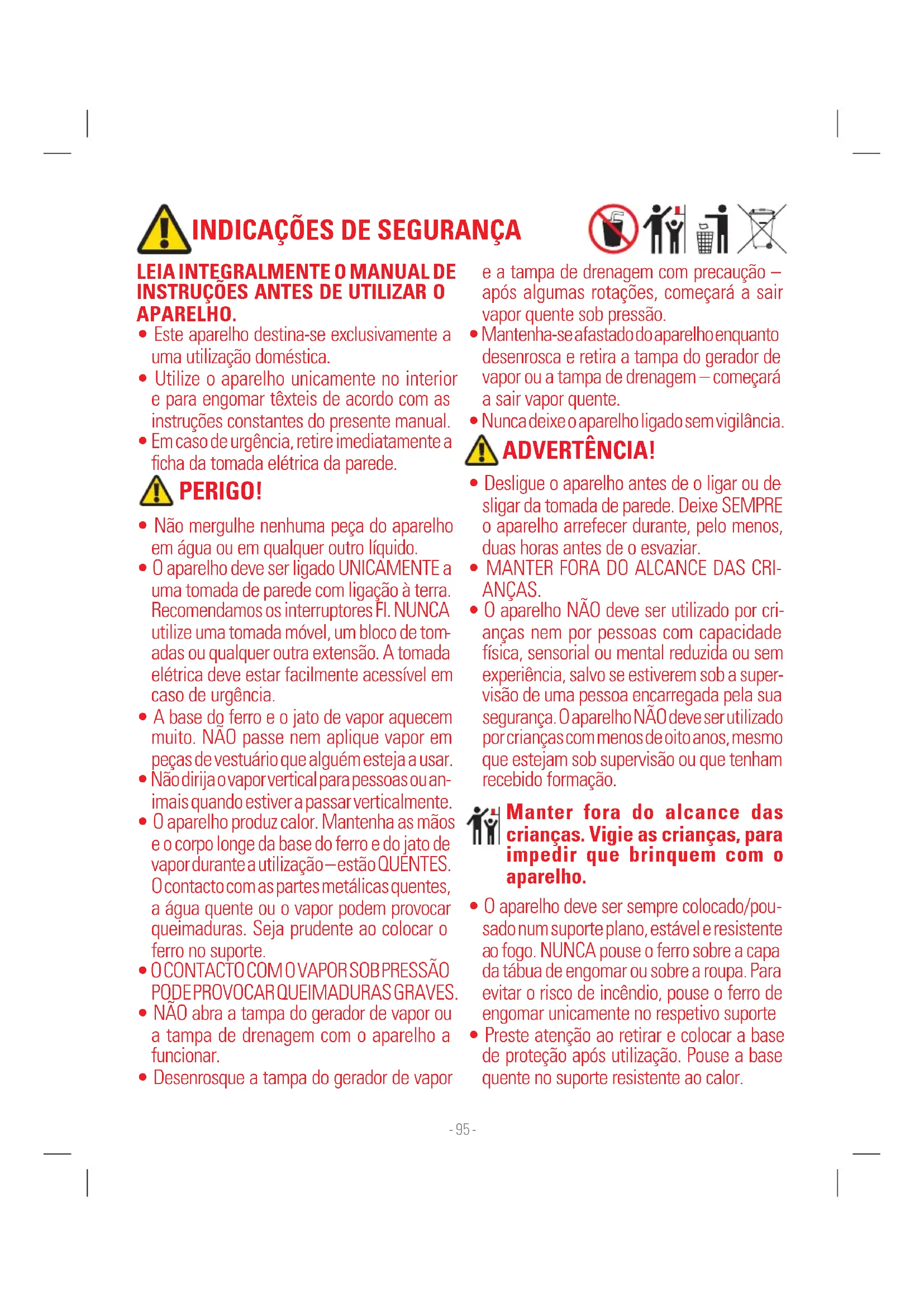 - Preste atenção ao retirar e colocar a base de proteção após utilização. Pouse a base quente no suporte resistente ao calor. Manter fora do alcance das crianças. Vigie as crianças, para impedir que brinquem com o aparelho. ADVERTÊNCIA! PERIGO!- 96 -