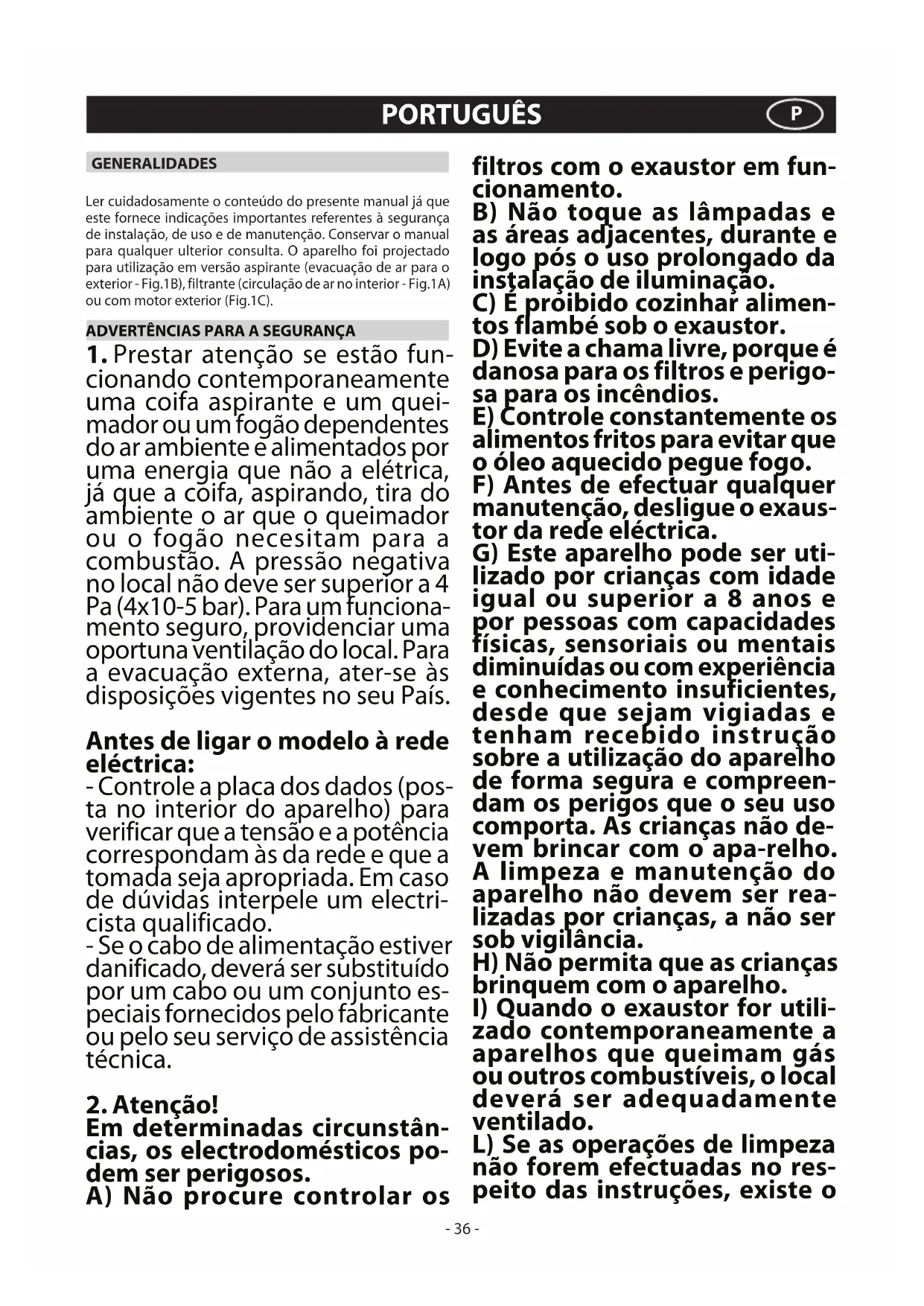 GENERALIDADES Ler cuidadosamente o conteúdo do presente manual já que este fornece indicações importantes referentes à segurança de instalação, de uso e de manutenção. Conservar o manual para qualquer ulterior consulta. O aparelho foi projectado para utilização em versão aspirante (evacuação de ar para o exterior - Fig.1B), filtrante (circulação de ar no interior - Fig.1A) ou com motor exterior (Fig.1C).