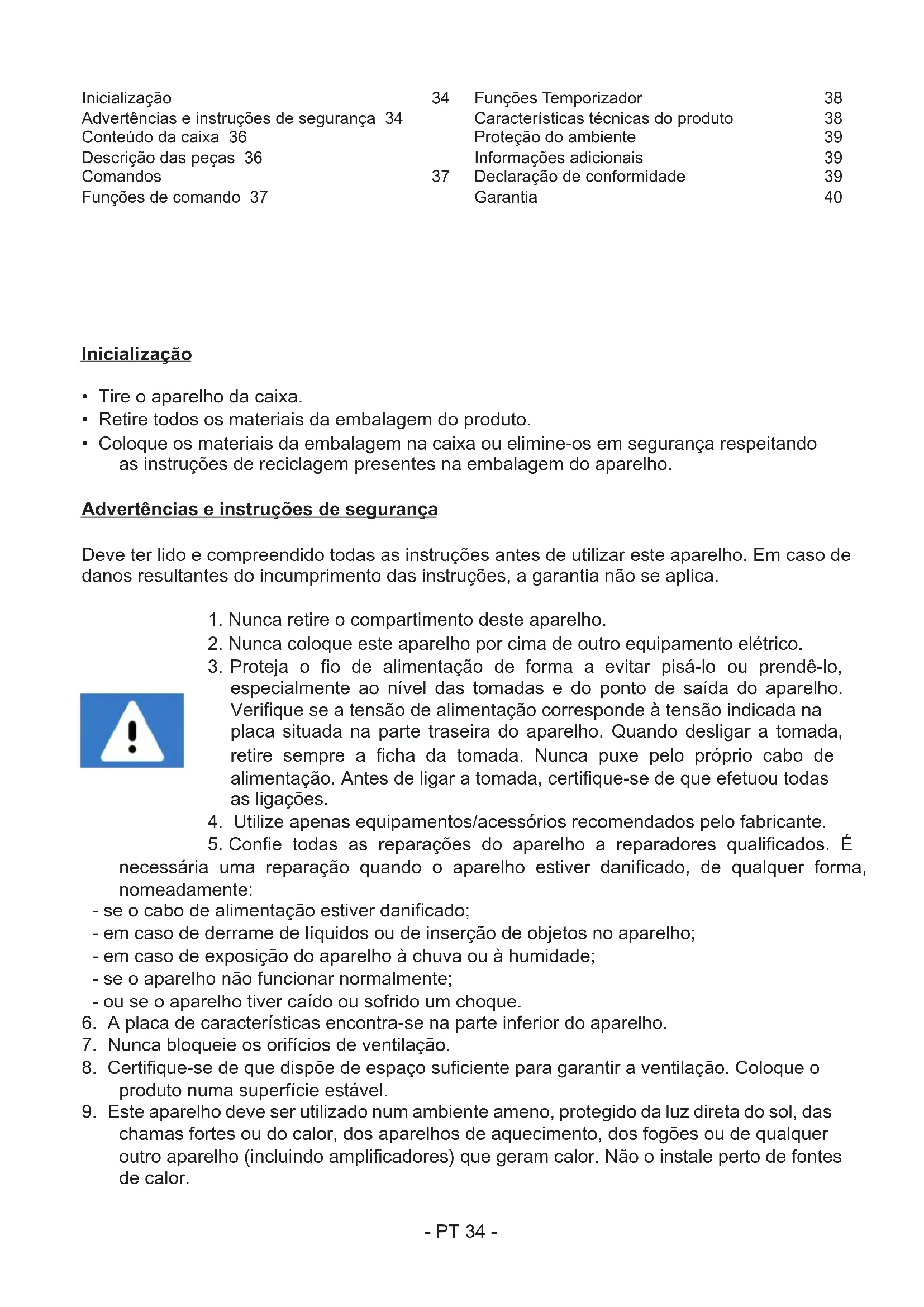 chamas fortes ou do calor, dos aparelhos de aquecimento, dos fogões ou de qualquer outro aparelho (incluindo amplicadores) que geram calor. Não o inale perto de fontes de calor. Inicialização 34 Advertências e instruções de segurança 34 Conteúdo da caixa 36 Descrição das peças 36 Comandos 37 Funções de comando 37 Funções Temporizador 38 Características técnicas do produto 38 Proteção do ambiente 39 Informações adicionais 39 Declaração de conformidade 39 Garantia 40- PT 35 -