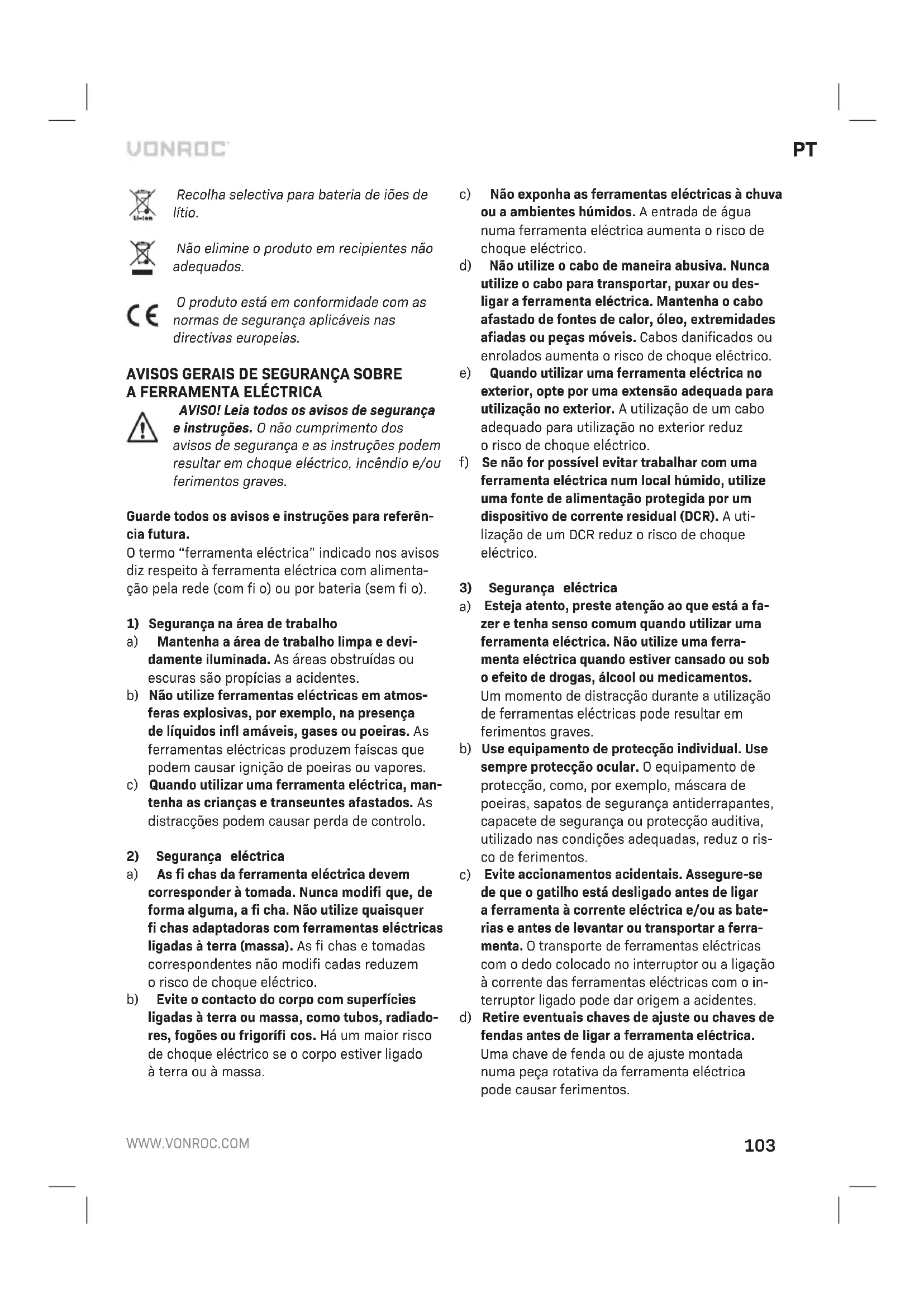 a) Não abra abateria. Perigo de curto-circuito. b) Proteja abateria do calor, por exemplo, contra exposição contínua aluz solar, fogo, água ehu- midade. Perigo de explosão. c) Em caso de danos euso inadequado da bateria, podem ser emitidos vapores. Ventile aárea econtacte um médico se houver queixas. Os vapores podem irritar osistema respiratório. d) Utilize abateria em conjunto com oseu produto industrial da Vonroc. Esta é aúnica protecção contra sobrecarga perigosa. e) Abateria pode ser perfurada por objectos da- nifi cados como pregos ou chaves de parafusos ou se for aplicada força externa. Pode ocorrer um curto-circuito interno eabateria pode quei- mar, causar fumo, explodir ou sobreaquecer.