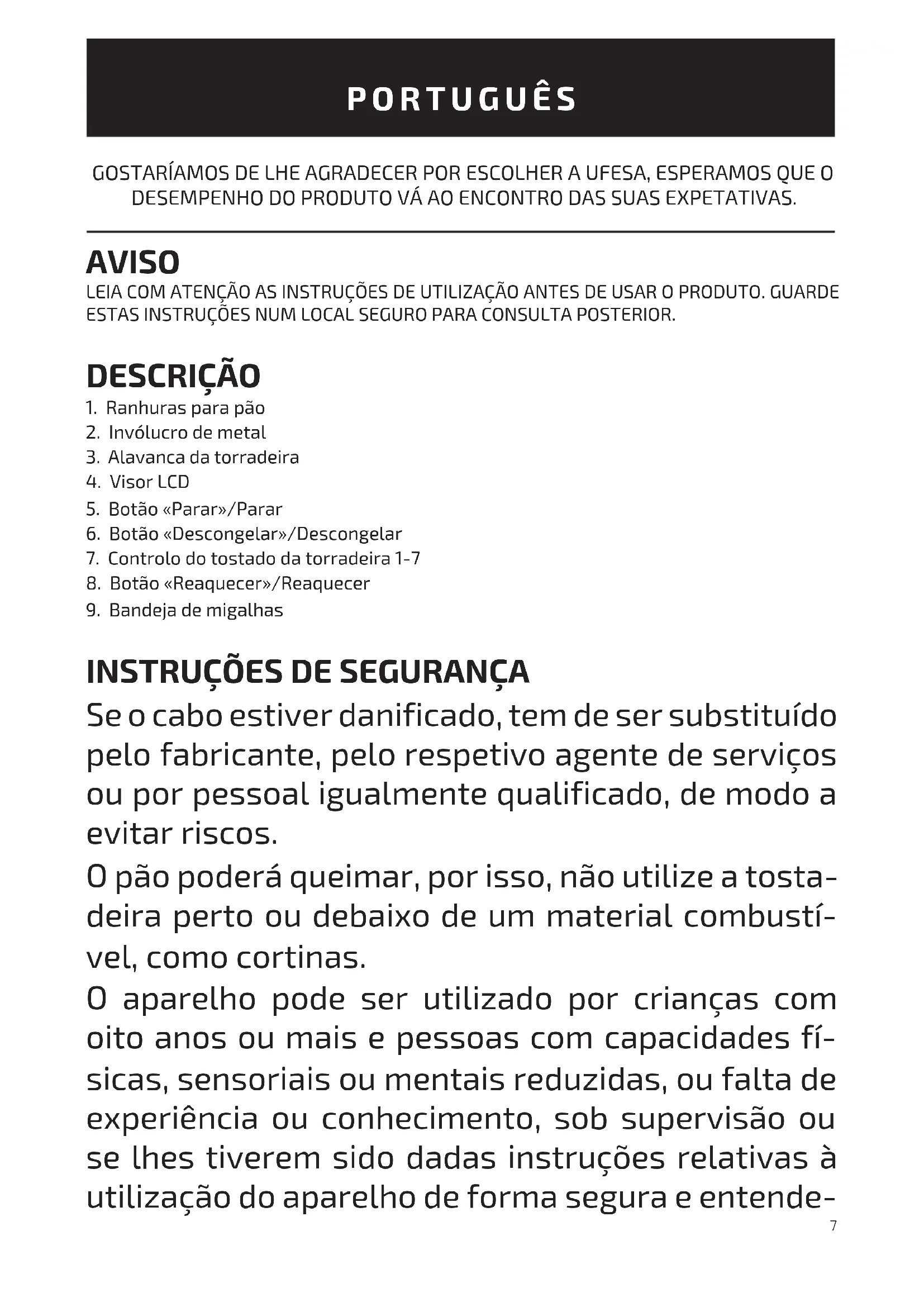 luzes indicadoras acedem e o processo de tostado iniciará. O ecrã do visor LCD do tubo digital apresenta apenas o grau de tostado. Prima +/- para selecionar o grau de tostado (1 a 7). Caso não apareça outro comando em 3 segundos, a tecla do grau de tostado será confirmada automaticamente ao acender a luz. A tecla de função selecionada permanece ligada após piscar por 3 segundos, As teclas de função restantes apagam-se mas a tecla de função «Parar» e a tecla de função +/- per- manecem ligadas. Pode selecionar o grau de tostado pretendido ao utilizar o seletor de grau de tostado. O ajuste é contínuo, correspondendo o nível 1 ao tostado claro e o nível 7 ao tostado escuro. O tostado ficará dourado quando ajustar o seletor para o grau de tostado médio. Pode interromper o processo de tostado a qualquer momento ao pressionar a tecla de função «Parar». Quando o grau de tostado selecionado for alcançado, o pão é automaticamente ejetado. O aparelho irá desligar-se. Recomendamos as definições de tonalidade de tostado seguintes: -Clara para pão tirado do frigorífico ou fatias de pão congeladas.10 -Média para waffles congeladas -Escura para fatias grossas de pão congelado e fatias grossas de torrada. Deixe que a unidade arrefeça antes de guardá-la. CANCELAR: Caso pretenda parar o processo de tostado. AQUECER: Permite que reaqueça o pão já torrado ou que o torre novamente, pão que não tenha sido suficientemente torrado em pouco tempo sem alterar a intensidade do tostado. DESCONGELAR: Permite que torre pão que tenha sido congelado. FUNÇÃO ADICIONAL DE EJEÇÃO O aparelho inclui uma função adicional de ejeção que lhe permite ejetar a torrada de forma mais conveniente. É feito ao puxar para cima a alavanca da torradeira.