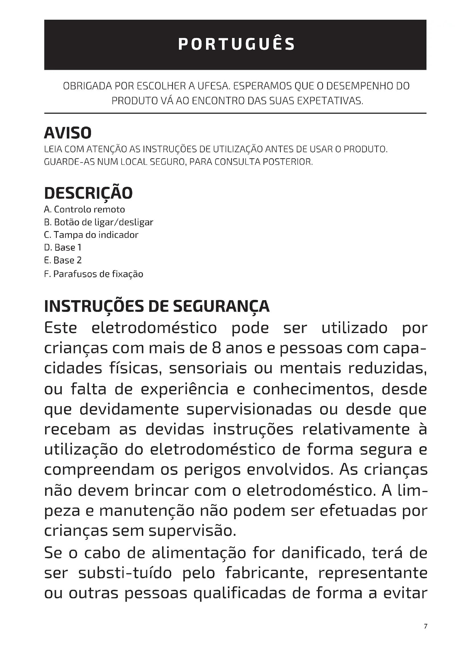 Este eletrodoméstico pode ser utilizado por crianças com mais de 8 anos e pessoas com capa- cidades físicas, sensoriais ou mentais reduzidas, ou falta de experiência e conhecimentos, desde que devidamente supervisionadas ou desde que recebam as devidas instruções relativamente à utilização do eletrodoméstico de forma segura e compreendam os perigos envolvidos. As crianças não devem brincar com o eletrodoméstico. A lim- peza e manutenção não podem ser efetuadas por crianças sem supervisão. Se o cabo de alimentação for danificado, terá de ser substi-tuído pelo fabricante, representante ou outras pessoas qualificadas de forma a evitar PORTUGUÊS8 qualquer risco. É necessário desligar o aparelho antes de o montar, desmontar e limpar. Este aparelho está preparado para ser utilizado a uma altitude máxima de 2000 m acima do nível do mar. AVISOS IMPORTANTES Este aparelho destina-se exclusivamente a um uso doméstico para a ventilação de es- paços: não o utilize para outros fins. Qualquer outro uso deve ser considerando desade- quado e perigoso. O fabricante não assumirá responsabilidade por quaisquer danos resul- tantes do uso desadequado, incorreto e irresponsável e/ou por reparações efetuadas por pessoal técnico não qualificado. Não introduza os dedos nem qualquer outro objeto através da grelha de proteção da ven- toinha. Este aparelho deve ser mantido fora do alcance das crianças. Não use o aparelho se este não estiver a funcionar corretamente ou se aparentar estar danificado; em caso de dúvida, leve-o a um técnico qualificado. Não mova o aparelho quando este estiver em funcionamento. Quando o aparelho não estiver a ser usado, desligue a ficha da tomada elétrica. Não toque no aparelho com mãos ou pés húmidos. Não arraste o aparelho puxando-o pelo cabo para o deslocar. Não puxe o cabo nem o próprio aparelho para retirar a ficha da tomada elétrica. Para limpar o aparelho, siga as instruções indicadas no manual, na secção relativa à lim- peza e à manutenção. A B&B TRENDS, S.L. não assumirá responsabilidade por quaisquer lesões ou danos que o aparelho possa ocasionar a pessoas, animais ou objetos, decorrentes do não cumprimen- to dos avisos mencionados anteriormente. INSTALAÇÃO Após remover a embalagem, verifique o estado da ventoinha; em caso de dúvida, não o utilize e consulte um técnico qualificado. Os materiais da embalagem (sacos plásticos, esferovite, fixações, etc.) devem ser mantidos fora do alcance das crianças, já que são uma potencial fon- te de perigo. Antes de ligar o aparelho, verifique se os valores de tensão indicados na placa de caracterís- ticas correspondem aos das tomadas elétricas. Caso a tomada elétrica e a ficha do aparelho sejam incompatíveis, deverá trocar a ficha por uma que seja adequada, contactando um téc- nico qualificado que verificará se a parte do cabo da ficha é adaptado à tensão usada pelo aparelho. Em geral, o uso de adaptadores ou de extensões elétricas não é recomendado; caso necessário, devem estar em conformidade com as regras de segurança e a sua capacidade de amperagem não pode ser inferior à máxima indicada para o aparelho. A tomada deve ser de fácil acesso, de forma a ser possível desligar facilmente o aparelho em caso de emergência. Não coloque o aparelho perto de um lavatório ou de qualquer outro recipiente de líquidos (mantenha uma distância de pelo menos 2 metros) para evitar o risco do aparelho cair no líquido.9 Mantenha a ventoinha afastada de tecidos (cortinas, etc.) ou de materiais voláteis que pos- sam obstruir a grelha de ventilação; verifique também se a parte frontal da ventoinha está livre de materiais voláteis (pó, etc.). Certifique-se de que o cabo de alimentação não está em contacto com superfícies rugosas, quentes ou em movimento e que não está torcido nem enrolado em redor do aparelho. Coloque o aparelho sobre uma mesa ou superfície horizontal, lisa e estável; não o coloque sobre uma superfície inclinada (o aparelho pode cair). Em caso de avaria ou de funcionamento anormal, desligue a ventoinha e recorra à ajuda de pessoal técnico qualificado. MONTAGEM CUIDADO: Certifique-se de que o produto está completamente montado antes de o ligar à tomada elétrica. Para realizar a montagem, consulte a figura: posicione primeiro a base 1 (D), depois a base 2 (E) sobre a estrutura, certificando-se de as fixar com os 4 parafusos fornecidos (F). IMPORTANTE (Fig.2): existem 2 orifícios correspondentes na base, os 2 pilares colocados têm de passar através desses dois orifícios quando montar a base juntamente com as ventoinhas. UTILIZAÇÃO Antes de cada utilização, verifique se o aparelho está em bom estado e se a ficha elétrica não está danificada. Se o cabo de alimentação estiver danificado, solicite a sua troca junto do serviço de assistência do fabricante ou junto de uma pessoa com qualificação equiva- lente, de modo a evitar qualquer risco. Funcionamento A ventoinha pode ser colocada em funcionamento através do painel de controlo situado na parte superior da ventoinha (B) ou através do telecomando (A).