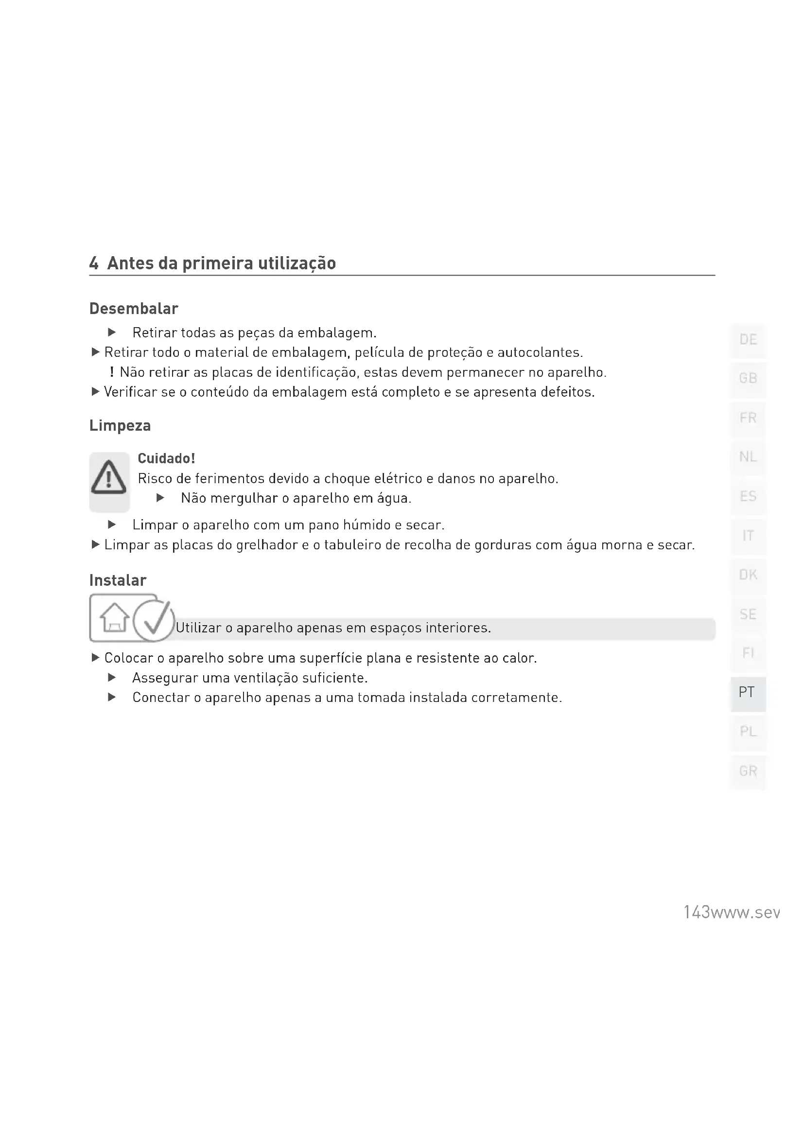 4 Antes da primeira utilização Desembalar f Retirar todas as peças da embalagem. f Retirar todo o material de embalagem, película de proteção e autocolantes. ! Não retirar as placas de identificação, estas devem permanecer no aparelho. f Verificar se o conteúdo da embalagem está completo e se apresenta defeitos. Limpeza Cuidado! Risco de ferimentos devido a choque elétrico e danos no aparelho. f Não mergulhar o aparelho em água. f Limpar o aparelho com um pano húmido e secar. f Limpar as placas do grelhador e o tabuleiro de recolha de gorduras com água morna e secar. Instalar Utilizar o aparelho apenas em espaços interiores. f Colocar o aparelho sobre uma superfície plana e resistente ao calor. f Assegurar uma ventilação suficiente. f Conectar o aparelho apenas a uma tomada instalada corretamente.144 www.severin.com